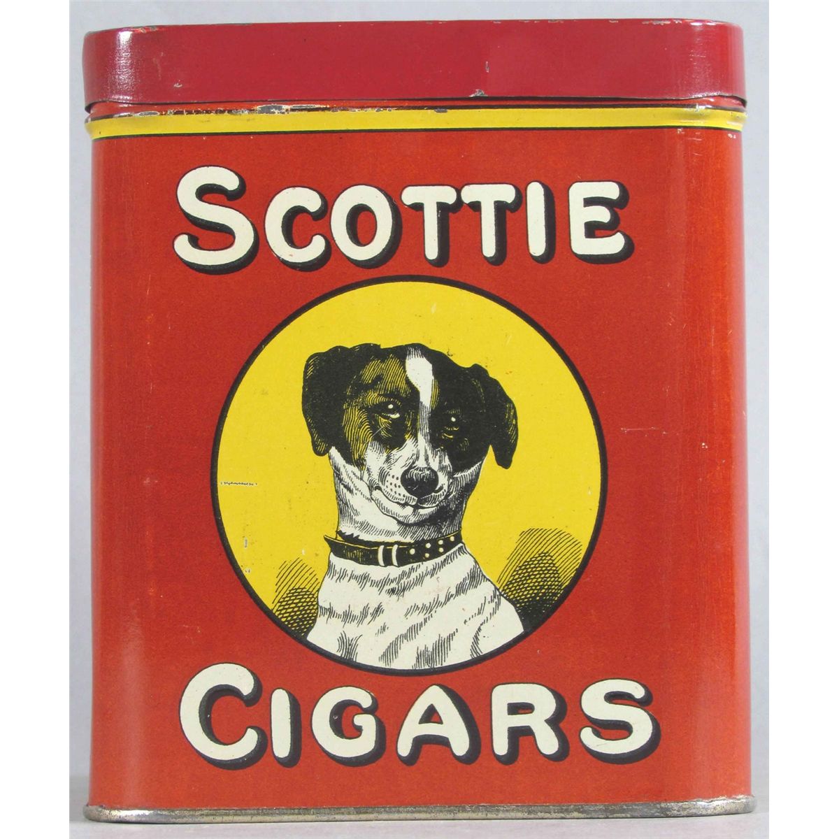 Rare Scottie 3 Cent Cigar Tin for 50 Cigars. A couple of very minor dents in the lid otherwise near mint condition. 4 1/4 inch square X 5 inches tall. Start Price $50