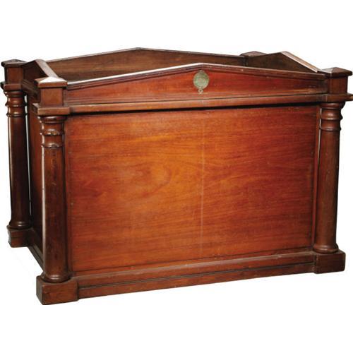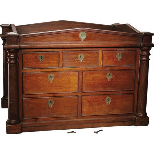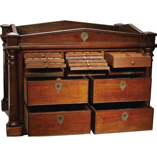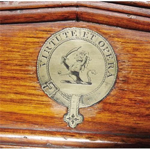 <B>Rare Scottish Clan Duff Coin Chest</B></I> made of handcrafted oak and with its original finish, was built in 1859 by Thomas Frasier Duff of and for Fetteresso Castle of Stonehaven, Kincardineshire, Scotland. This lovely piece in immaculate condition presents a wealth of drawers, four of which are hidden, that are numbered and designed specifically to organize and catalog an important coin collection. The drawers reveal a myriad of trays that are subdivided. The majority of these trays sport the original velvet lining, while a modest amount have had their linings replaced with more modern felt. Of particular interest is the inlaid and engraved brass medallion plaque to the front that includes the clan's Arms of a lion rampant gules holding a dagger in its paw and the Latin inscription <I>VIRTUTE ET OPERA.</B></I> On the reverse of the chest is another inlaid and engraved brass medallion plaque clearly describing the item's provenance. This same craftsmanship is carried again to the front of the chest in the inlaid and engraved brass keyhole guards. It is important to note that Fetteresso Castle was original built in the 14th Century in the style of towerhouses common to nobility of the day. The castle was rebuilt in 1761 as a Scottish gothic-style Palladian manor. Late in the 17th Century, ownership of Fetteresso Castle was transferred to Clan Duff, which further expanded the building around the old towerhouse. The Duff's ownership extended into the 1940s, when the castle was sold to Maurice and Geraldine Simpson, Mrs. Simpson the heir to the Pringle Knitting fortune. This chest was purchased in Europe by a United States airman during World War II and brought to the U.S. The chest was acquired more than 40 years ago by its present owner, who was a charter member of the Florida United Numismatists and devout ANA member during his lifetime. The chest measures 30" wide