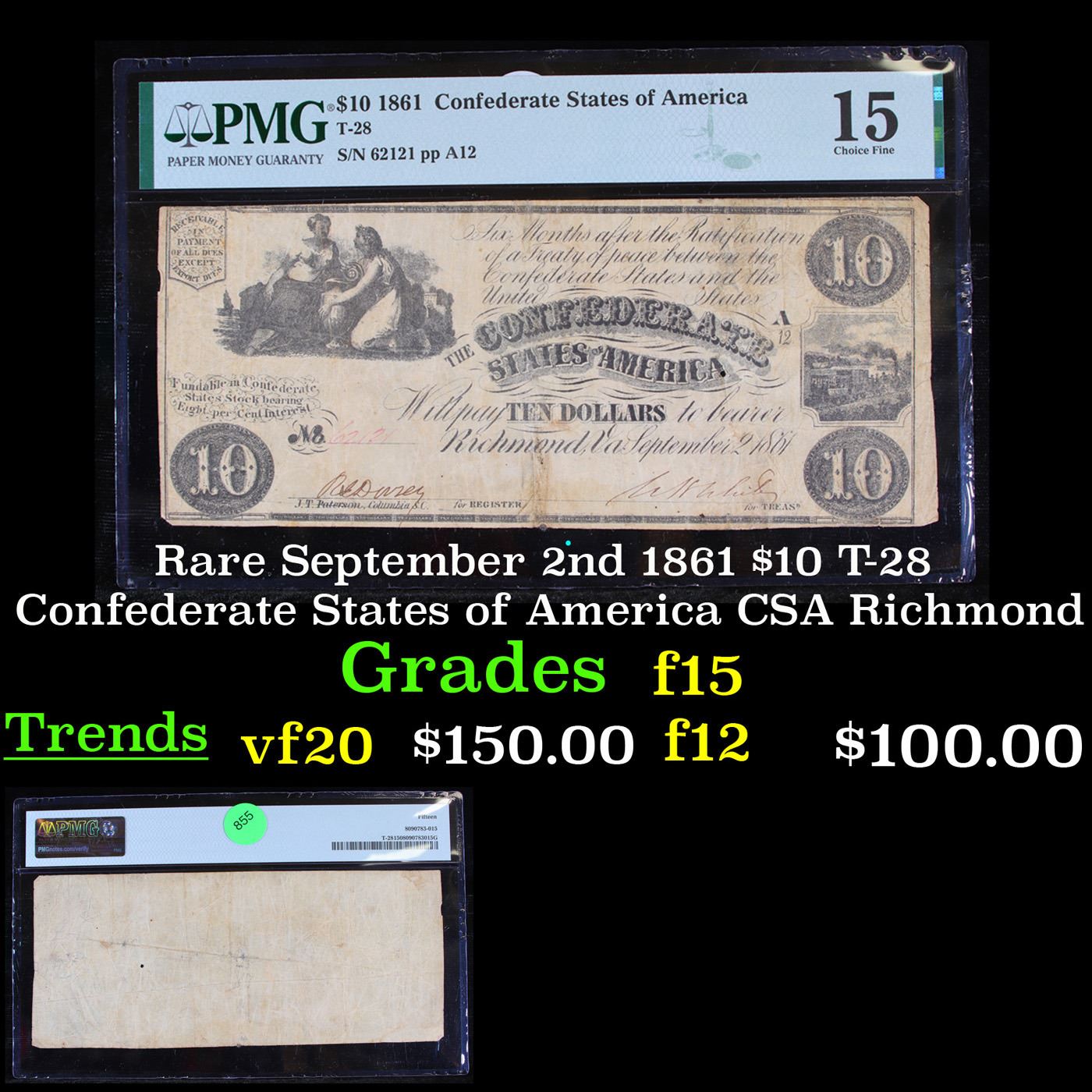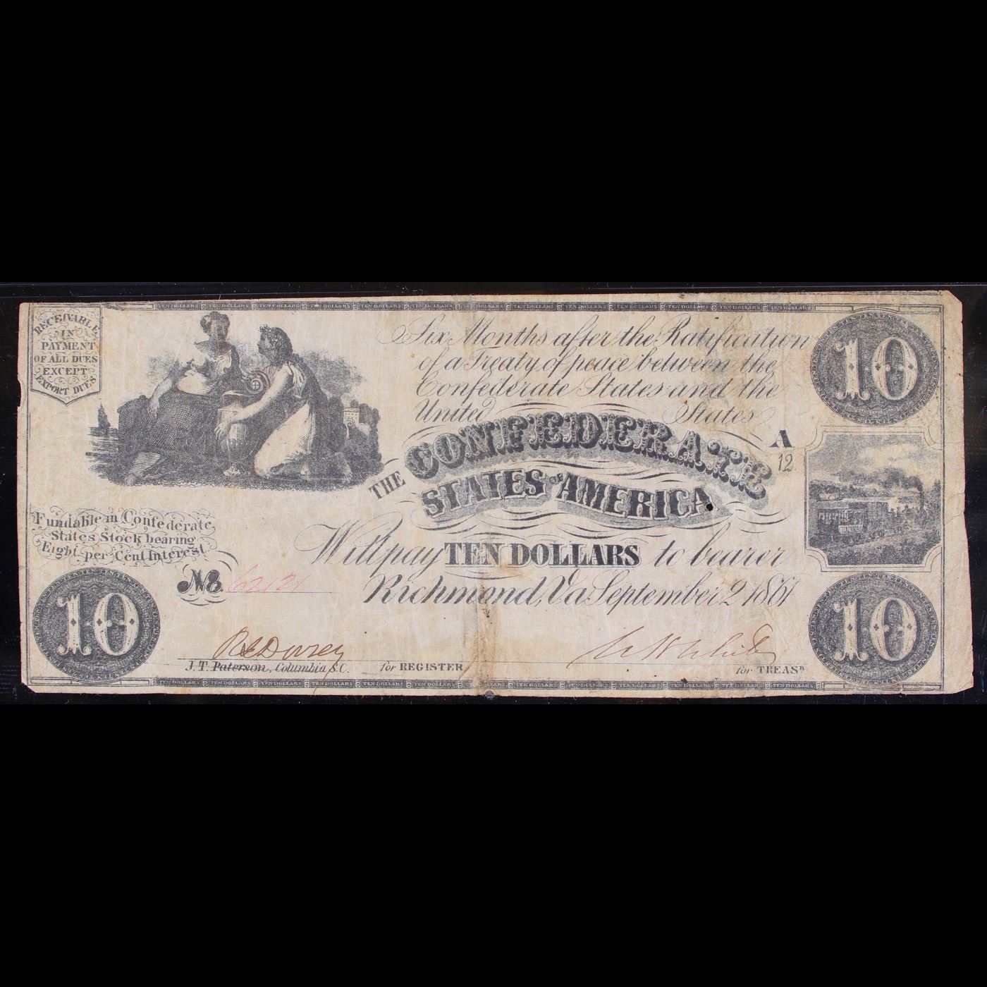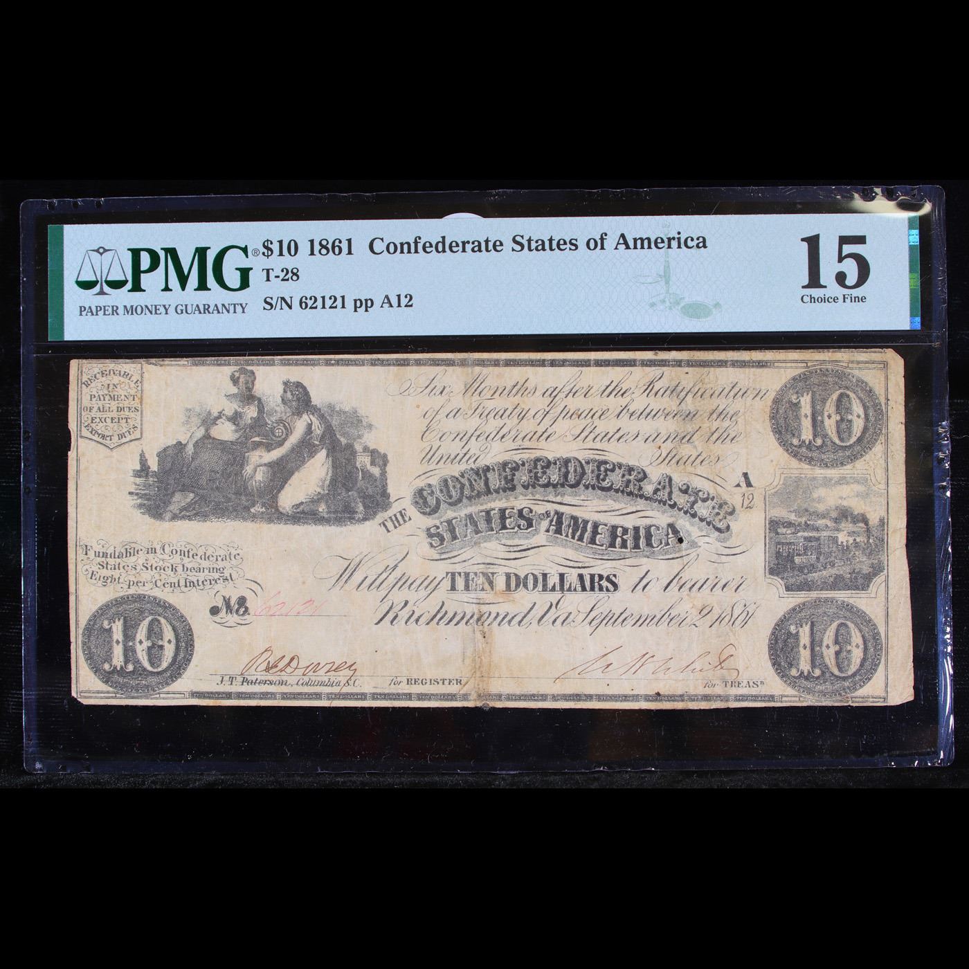 Rare September 2nd 1861 $10 T-28 Confederate States of America CSA Richmond Graded f15 By PMG. This $10 Confederate note shows two seated women (Ceres and Commerce) holding an urn in the upper left side of the note and an illustration of a train on the right side of the note. This note was printed with black ink on either plain or watermarked paper. This note has no design on the back. After the Civil War broke out in 1861, the newly established Confederate government began to issue it's own money as legal tender to the citizens of the South. The gamble was that if the South won the war, the money would be redeemable. The 1st note from the Government of the Confederate States of America was issued in April of 1861. From then on, notes were issued on through 1864. Almost every Confederate note was painstakingly hand signed and numbered. It is not uncommon for these notes to have uneven, or rough borders since scissors or shears were used to hastily cut the sheets of notes apart.
