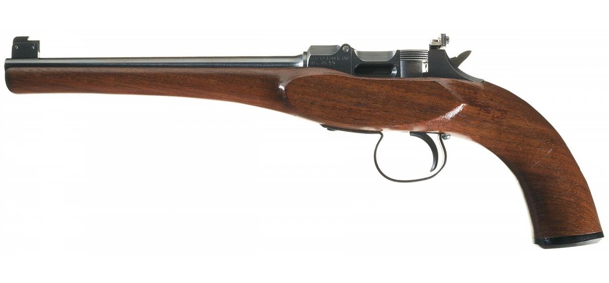 Limited production, number 19 out of approximately 200 manufactured between 1947 and 1953. Single shot, hinge lock pistol with blade front and adjustable notch rear sights, serrated trigger and hammer spur and one piece full length walnut stock with black plastic grip cap. Marked A.H.TOMPKINS/SPRINGFIELD/MASS.,U.S.A." on the top of the chamber with the patent information and serial number on the left side and "MF'D. AT/VARSITY MFG.CO." on the right.