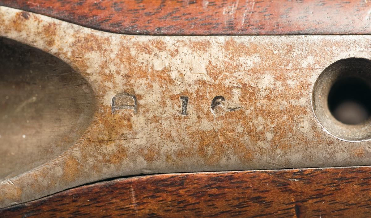 Condition: Very good plus. The barrel retains 50% faded original blue finish with a smooth mottled brown patina on the breech end, high edge wear and scattered minor spotting. The remaining surfaces have a smooth brownish and silver gray patina with much of the original casehardening pattern remaining on the action. The forearm shows a number of dents, chips and some loss of wood. There is a hairline crack on the top of the wrist at the tang and scattered minor gouges, dents and scratches on the buttstock. The markings are clear. The action is fine. With very few made and hard use on the Western Plains, these rifles are almost impossible to find in any condition.