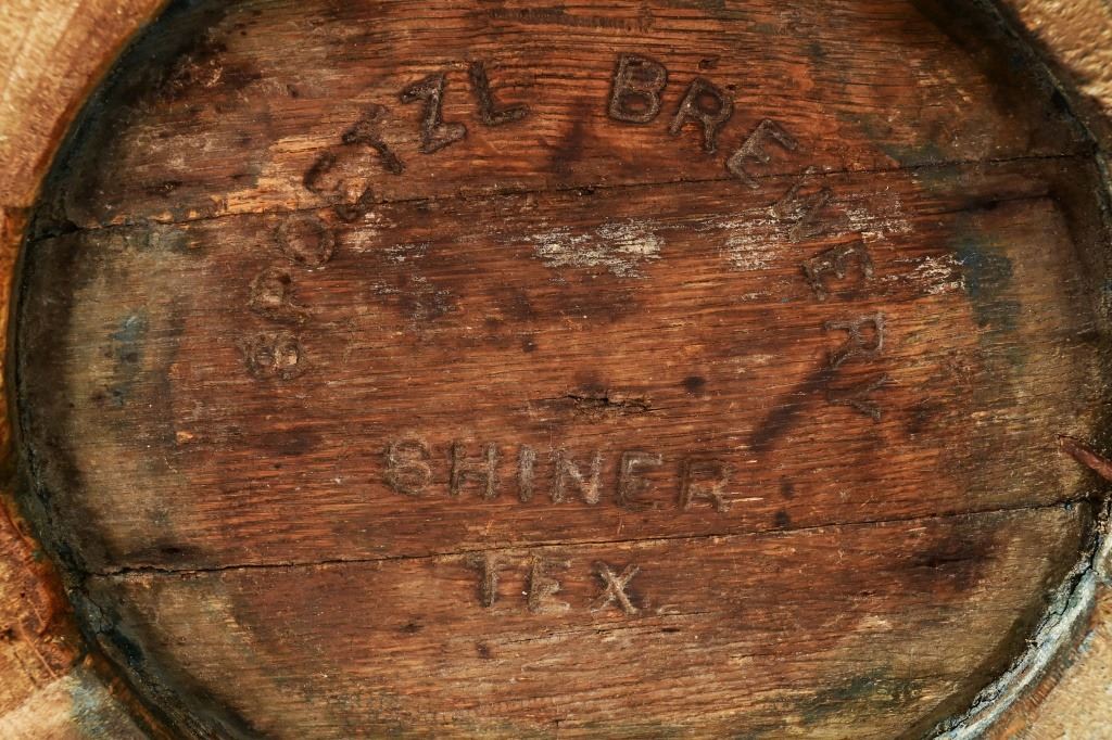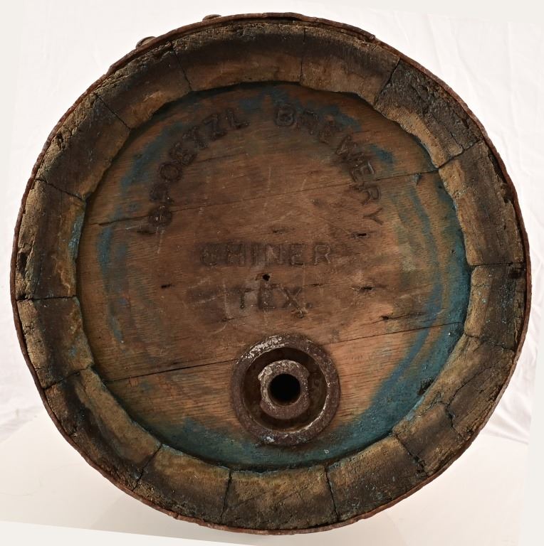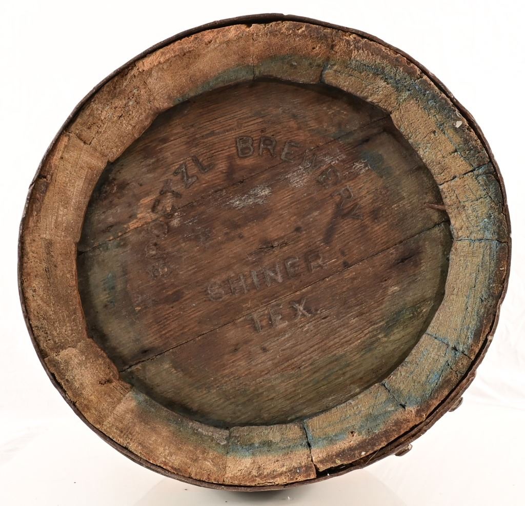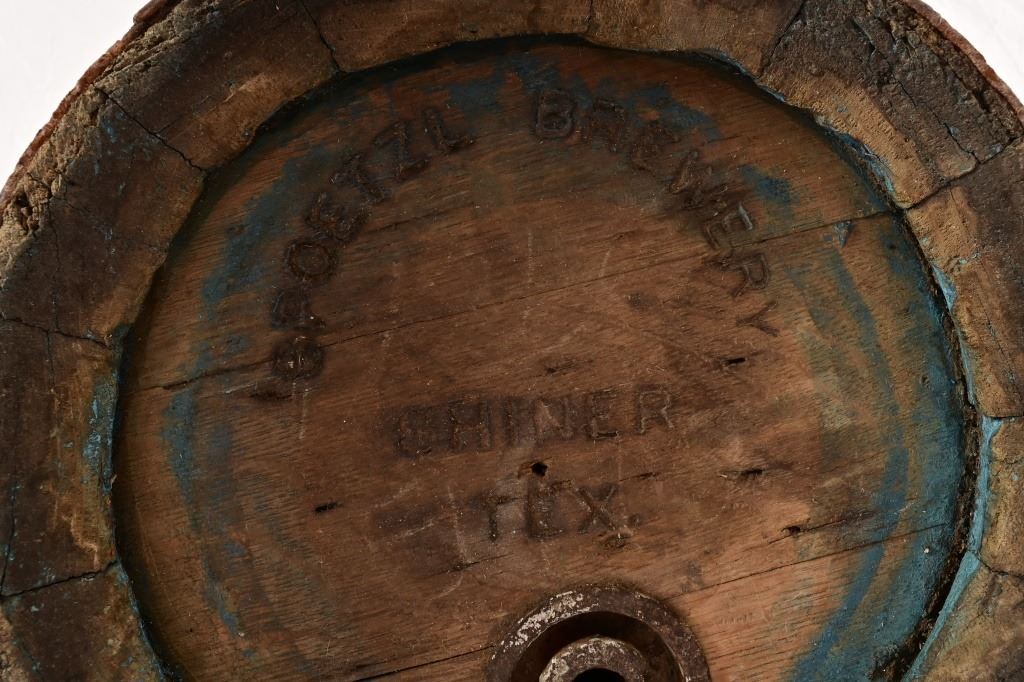 Would have sat on a bar cradle, tapped and served direct from the barrel. Very nice patina, and a very scarce early Spoetzl Brewery Shiner Beer collector item. 18.5" x 15"