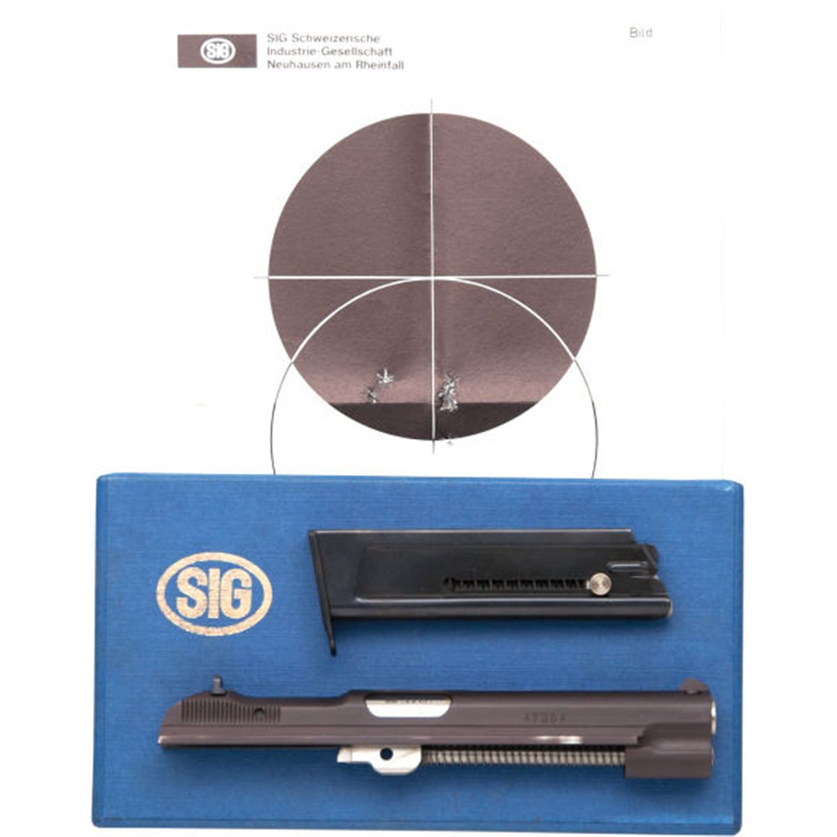 Rare Sig Conversion Kit Barrel and Magazine. Serial no. 47364, .22 caliber, 4 3/4-inch barrel. Browned finish. Contained in factory box with accompanying magazine, target and instructions. Condition: Excellent. Box excellent.