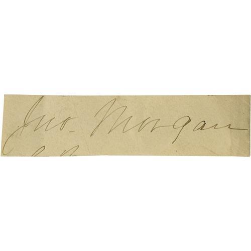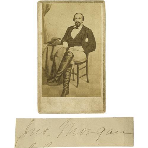<B>Confederate General John Hunt Morgan, a Rare Signature.</B></I> Large clipped signature in black ink, measuring 4" x 1", signed "<I> Jno. Morgan</B></I>" Accompanied by a scarce Brady/Anthony of Morgan. <BR><BR>The notorious leader of "Morgan's Raiders," this Confederate Brigadier General led disruptive calvary raids into Union territory in Tennessee, Kentucky, and even Ohio, until he was killed in action near Greenville, Tennessee. A very tough Confederate autograph.