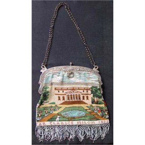Signed AR Clarice Milon dated 1822, hand made beaded evening purse, depicting in splendid color her lavish estate grounds, the verso depicting a cheerful bird perched on a limb tending to her egg nest, the mouth of the purse in outstanding high relief floral motif accented by a flanking pair of swan chain anchors. The purse is in pristine working condition, undamaged and un repaired and the body of the purse (excluding the chain and tassels) measures 7.5 inches x 8.75 inches. This rare and exquisit example would make an envious and valuable addition to any fine collection. <P>****NOTE: Email for larger images.
