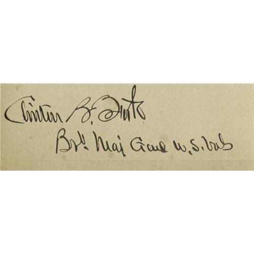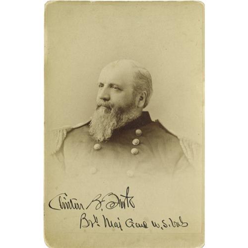 <B>Rare Signed Cabinet Photo of Clinton B. Fisk, Union General and 1888 Prohibition Party Candidate for President.</B></I> Fisk garnered 2.2% of the popular vote against Cleveland and Harrison in 1888. An ardent early abolitionist and temperance advocate, he joined the army in 1861 as a private, but rose to the rank of brevet major general, serving with Grant at Vicksburg and later commanding the District of St. Louis. Active in business and charitable pursuits in the decades after the war, Fisk was an active Republican until 1884, when he broke to support Prohibition candidate John St. John. In 1886 he ran as a Prohibitionist for New Jersey Governor, before receiving the national nomination two years later. <BR><BR>Owing to his active public life, Fisk's autograph is not terribly rare in some forms. But we have never seen a signed photo, nor does the authoritative Sanders guide list one. This example is especially nice, as it is signed boldly on the front side, along with "<I>Brvt. Maj. Genl. U.S. Vols.</B></I>" Excellent condition. For accuracy we note the removal of the revenue stamp over the photographer's imprint on verso. 4.25" x 6.5".