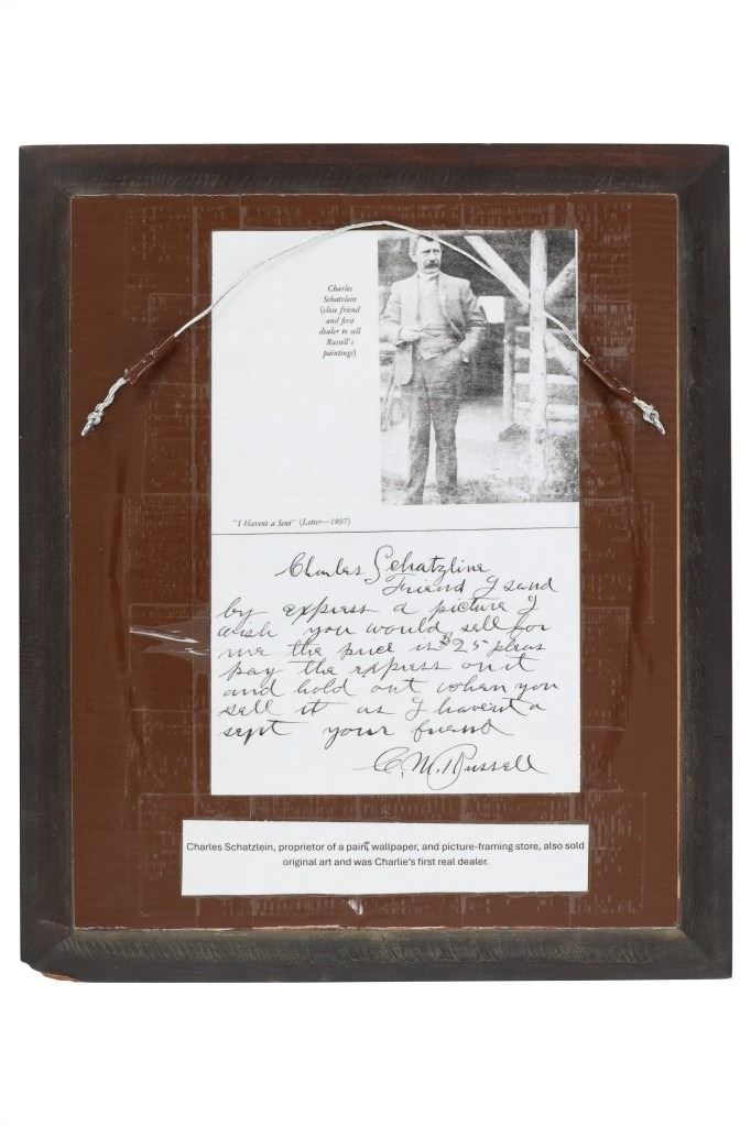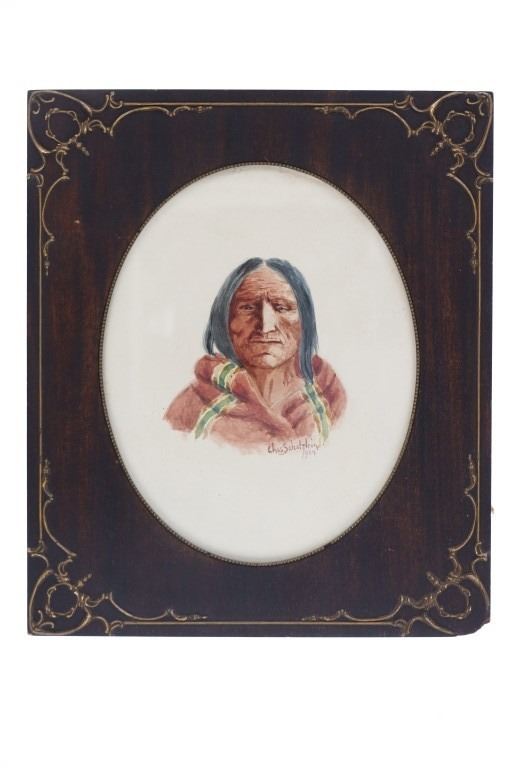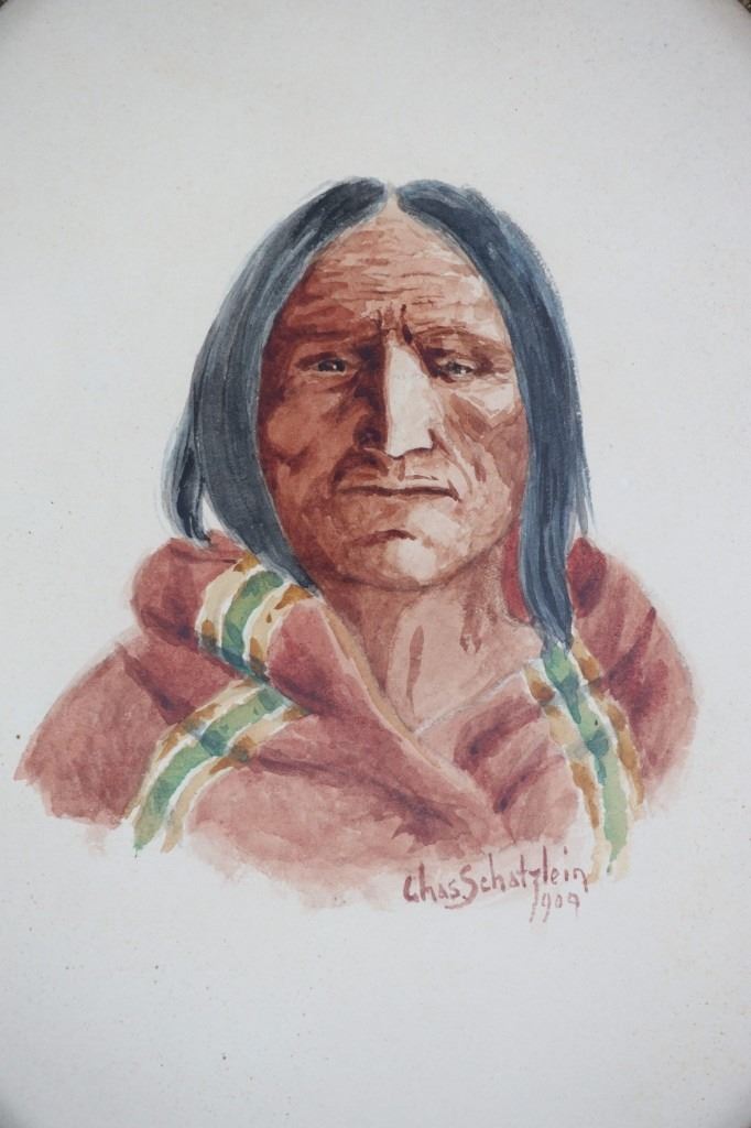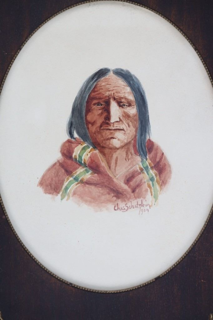 Presented in this lot is a Rare Original Signed Charles Schatzlein Watercolour on Paper, ca. 1909. Schatzlein is often considered legendary Western artist Charles Marion Russell’s first serious art dealer, that is, the first individual with a business that made the selling of Russell art an ongoing activity. He was also a close friend of Russell's. Schatzlein came to Montana with his parents, eventually learning the trades of painting and house decorating. In 1881 he opened a paper-hanging shop that expanded into the Schatzlein Paint Company in partnership with then Governor Rickards, selling paint, wallpaper, glass, custom framing, artists’ supplies, and pictures. Schatzlein (1857-1911 ) was an ardent amateur artist himself, and he recognized in Russell’s work a special gift. Consequently, he contented himself with painting replicas of Russells and signing them as such. But more than that, his paint store by 1897 was a venue for Russell art. William Bleasdell Cameron, traveling on assignment for Western Field and Stream, a new sportsman’s magazine published out of St. Paul, was captivated that May when he saw some Russells on display at a Butte hotel. When he inquired after the artist, he was immediately directed to Schatzlein’s store. In 1904, Schatzlein, Russell and Edgar Paxson collaborated on a mural that decorated Schatzlein's dining room. Nancy Russell wrote for Charlie in 1902 that “Mr. Schaztlein has done more to raise the prices of my pictures than any friend I have.” Schatzlein accompanied Russell on many painting excursions and often painted together with him in studios and outdoors.Schatzlein and Russell collaborated on numerous occasions on the same painting. The watercolour features a Native American male wrapped in a trade blanket. Reverse has attached photocopy of a letter Russell sent to Schatzlein. Mounted in a gold gilt designed wood frame. Watercolour is in very nice preserved condition, no marring noted. Frame exhibits slight scuffing on edges. Visible art measures 7.5"W x 9.5"L, frame is 11.25"W x 13.25"L x .75"D, weight is 1lb, 12oz.