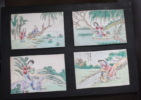 Rare Signed Old Chinese Romantic Landscape Scenes Copper Color Painted on Porcelain Plaque Set (4)