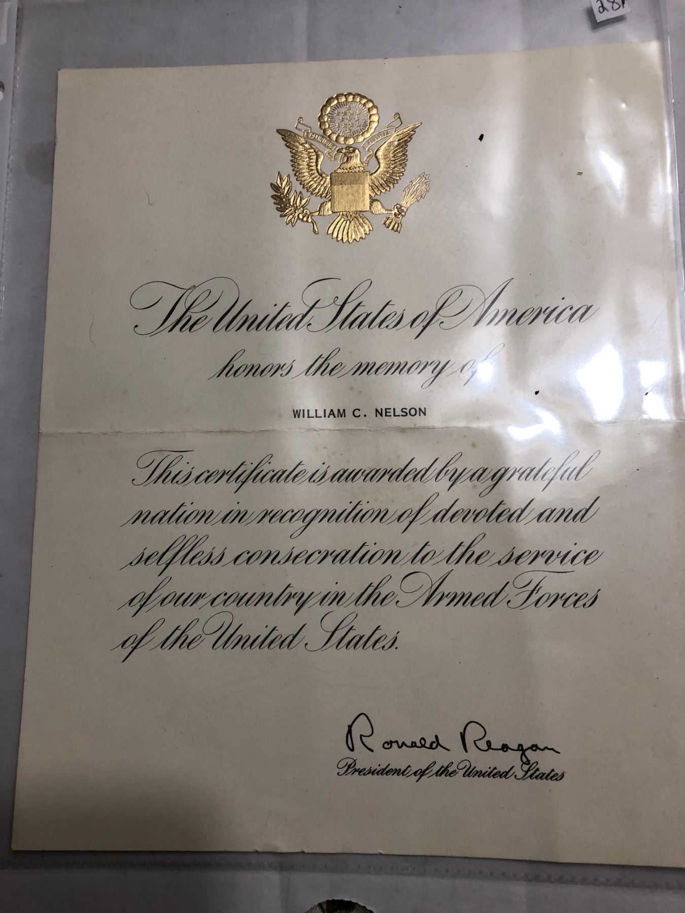Rare Signed Ronald Reagan Awarded Certificate on US Paper Honors the Memory of William C Nelson