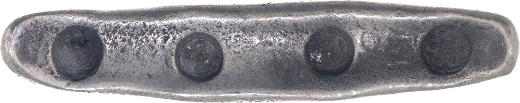Thailand- Laos, Silver Boat Money, Bar-shaped ingots resembling a Chala boat, Obv: four incused punch marks, Rev: a punch mark, 36.9g, 69.15x13.90mm, about extremely fine, Rare.