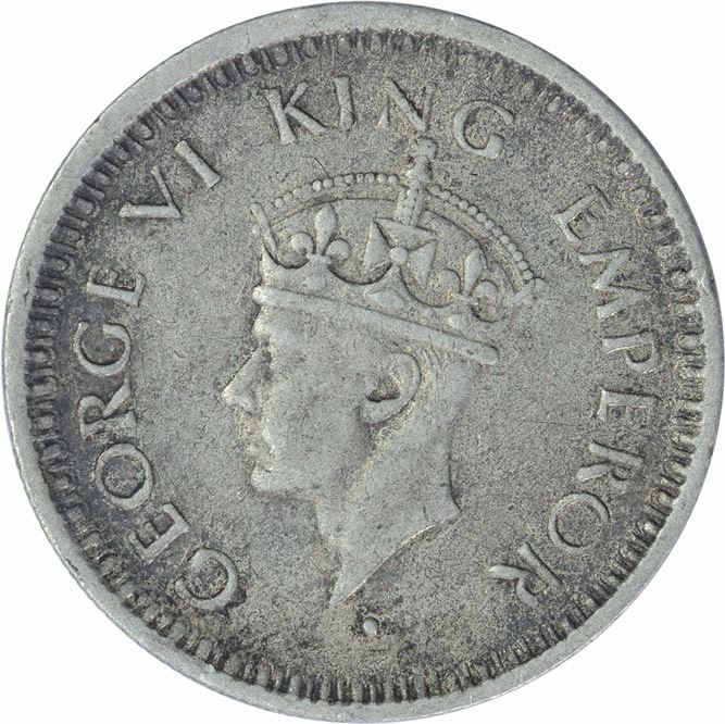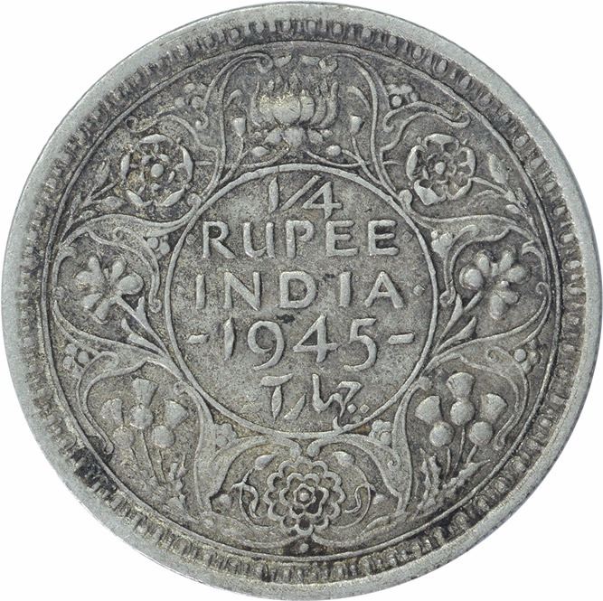 Rare Silver One Quarter Rupee Coin of King George VI of Bombay Mint of 1945.