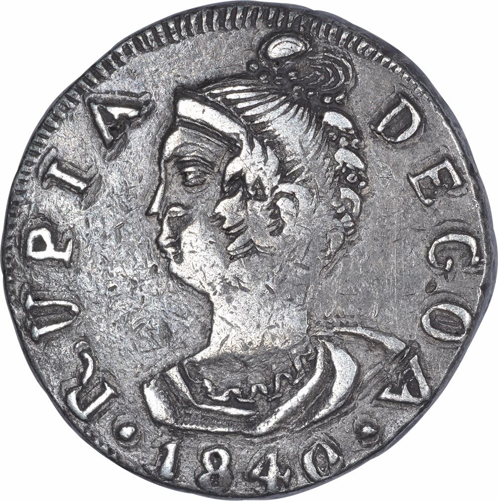 Indo-Portuguese, Goa, Maria II, Silver Rupia, 1840 AD, Obv:portrait bust of Maria II to left and complete date under the bust, Rev: crowned arms within sprays, 11.0g, 22.76mm,(KM # 269), about extremely fine, Rare.