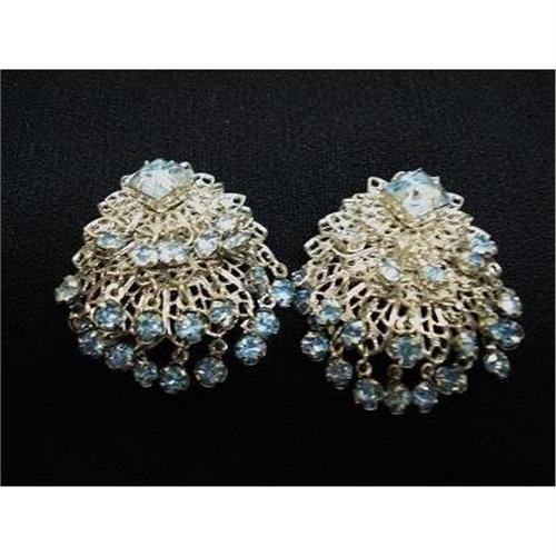 BEAUTIFUL SILVER TONE AND BLUE RHINESTONE CLIP-ON EARRINGS, MADE IN FILIGREE STYLE WITH 20 TINY FACETED BLUE STONES ATTACHED TO FINE CHAIN WHICH ALLOWED EACH STONE TO MOVE AND SHOW IT'S BEAUTY, THERE IS ONE LARGE SQUARE STONE AT THE TOP, IT TRULLY IS BEAUTIFUL - VERY GOOD QUALITY WITH EXCELLENT DETAIL - as per images, Excellent condition,Measuring about 1 3/4 long,US Buyer to pay 7.00 for shipping plus insurance.THANKS.