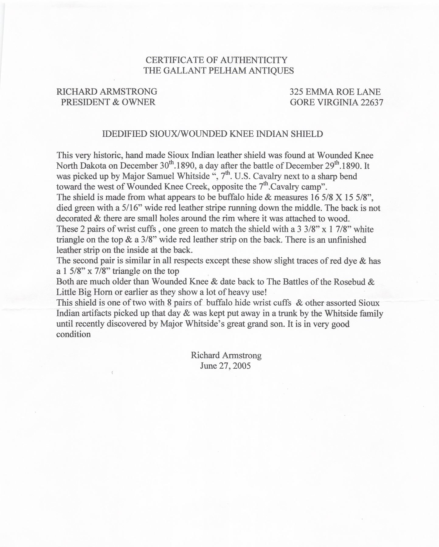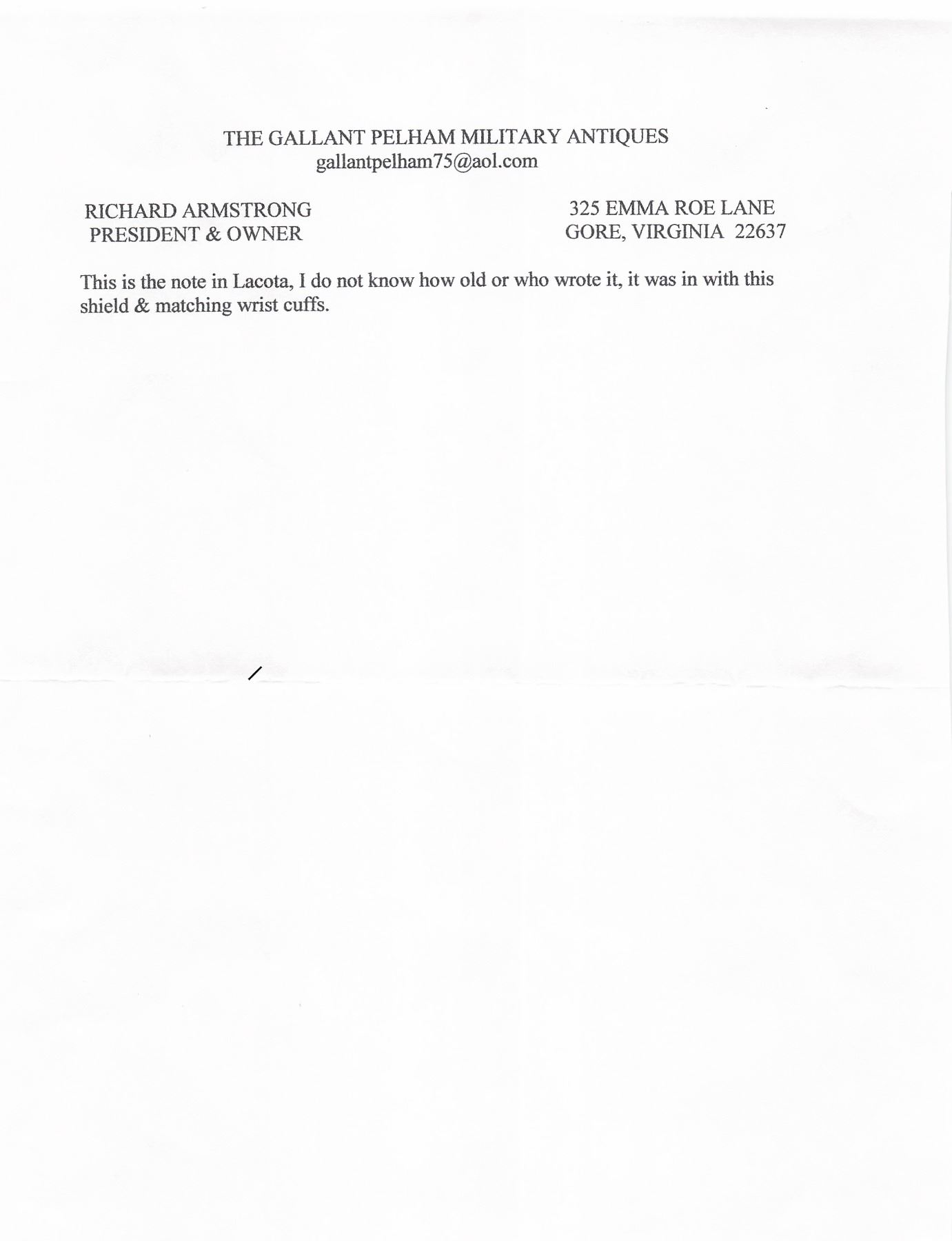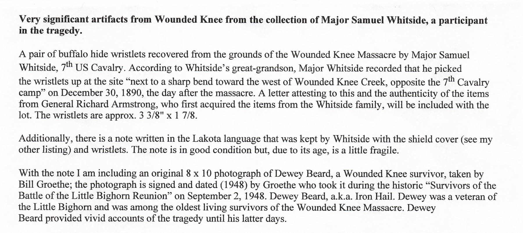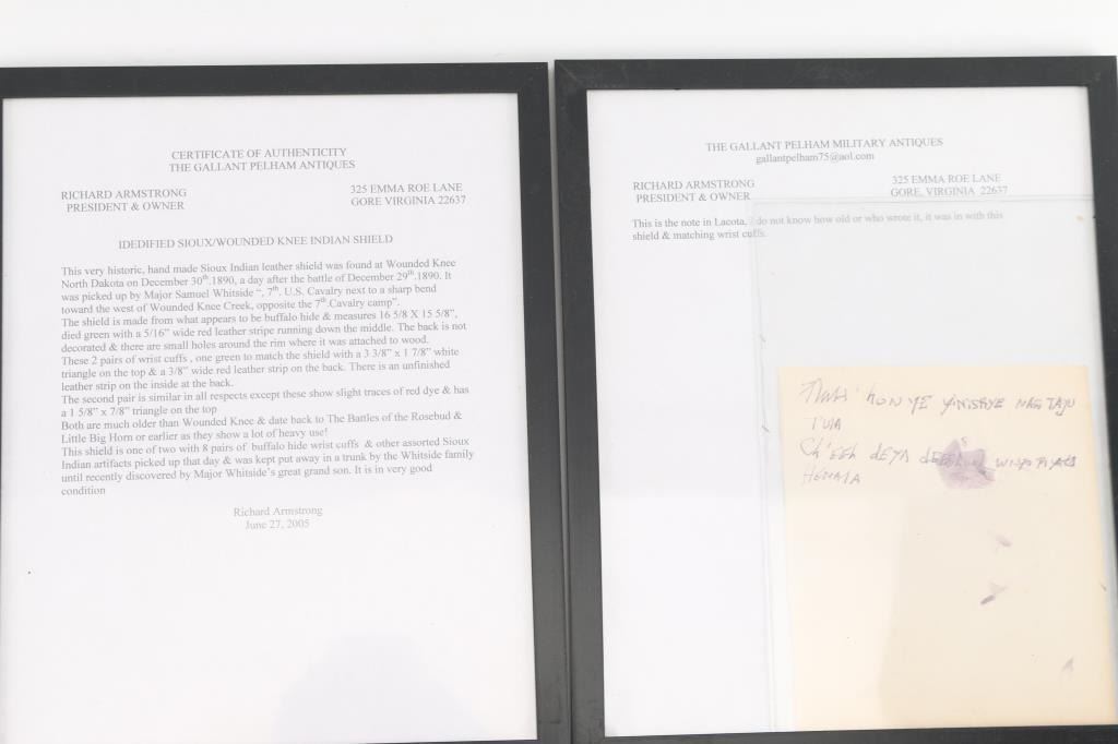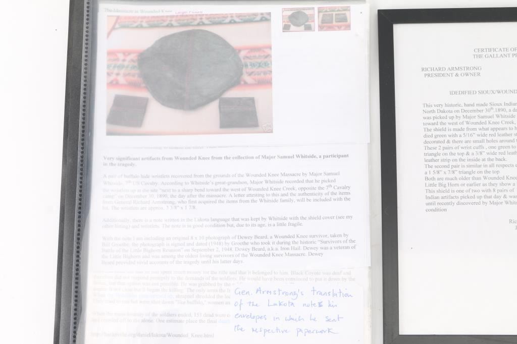 Recovered from the Wounded Knee Massacre by Major Samuel Whitside, 7th U.S. Calvary. A letter is included from General Richard Armstrong, who acquired the items from the Whitside family, attesting to the authenticity of the items and recounting the story of their recovery by Major Whitside. Included in the lot is a note written in the Lakota language which was kept with the items by Major Whitside.