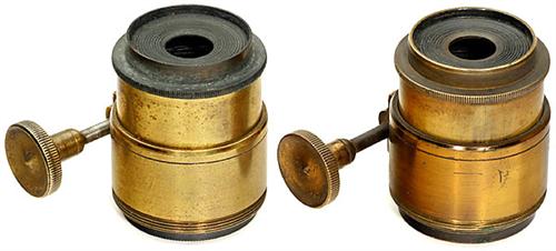 Rare Small Pair of Stereo Lenses Unmarked brass lenses, probably English (Lancaster?), height: 40 mm, diameter: 31 mm, rack-and-pinion focusing!<Br>