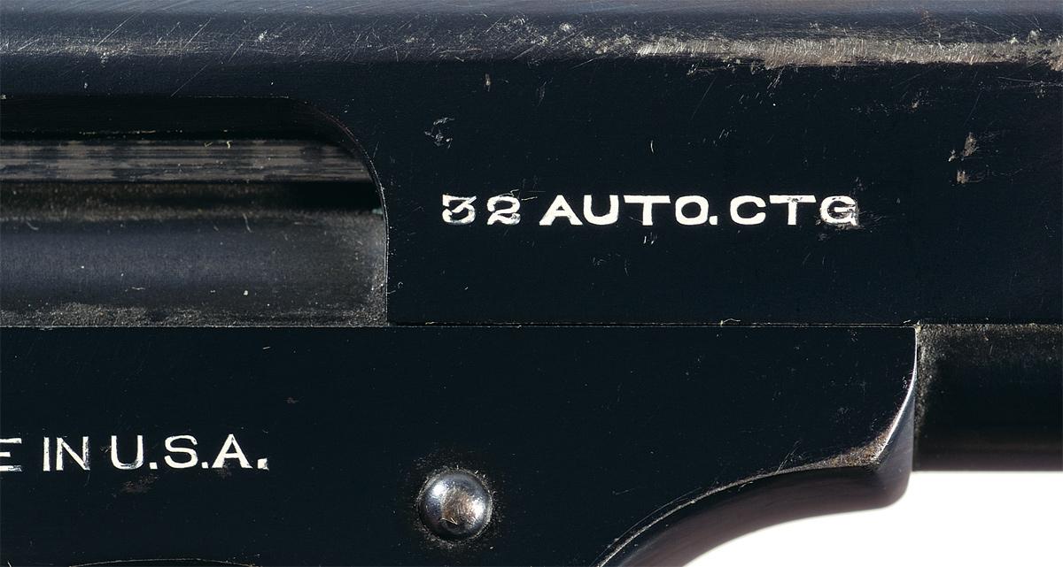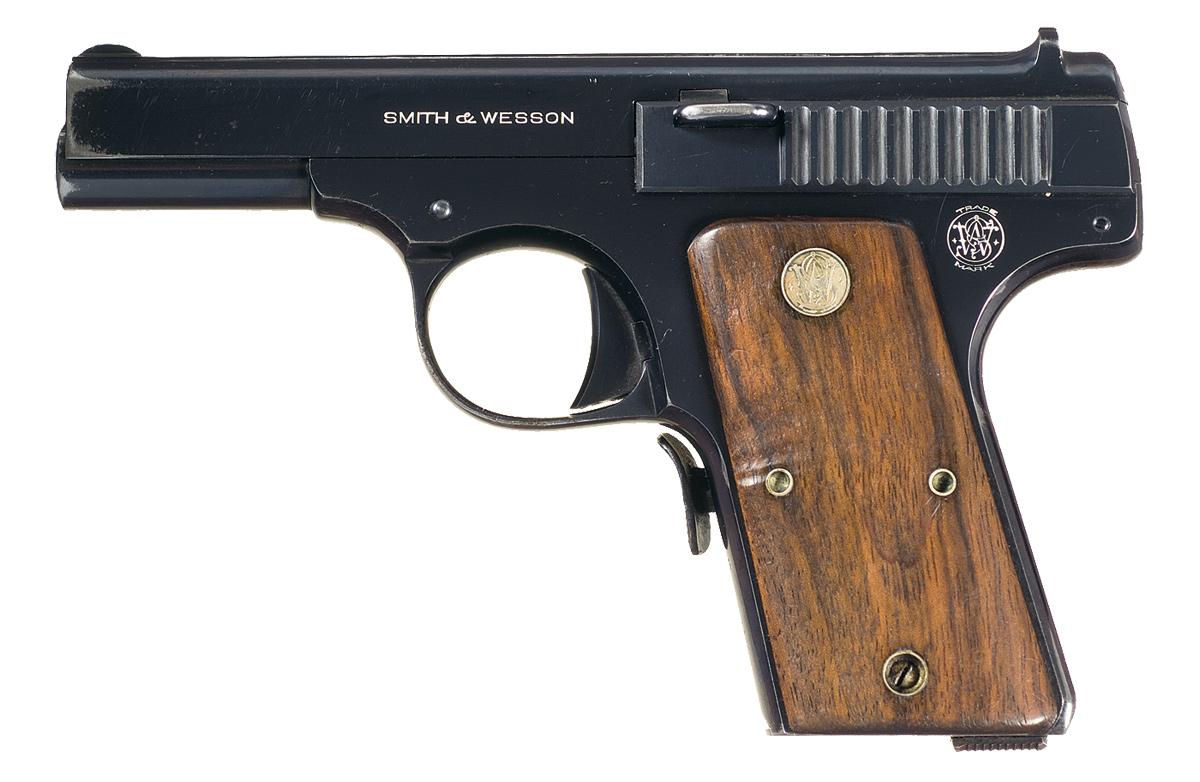 Produced in limited numbers from 1924 to 1936 it is one of approximately 957 manufactured. Fixed front sight and notch rear sight. Two line address on top of barrel, "SMITH & WESSON" on the left and "32 AUTO.CTG" on the right. Serrated front strap safety. Two-piece smooth walnut grips with inlaid Smith & Wesson medallions. All markings are highlighted in white.