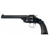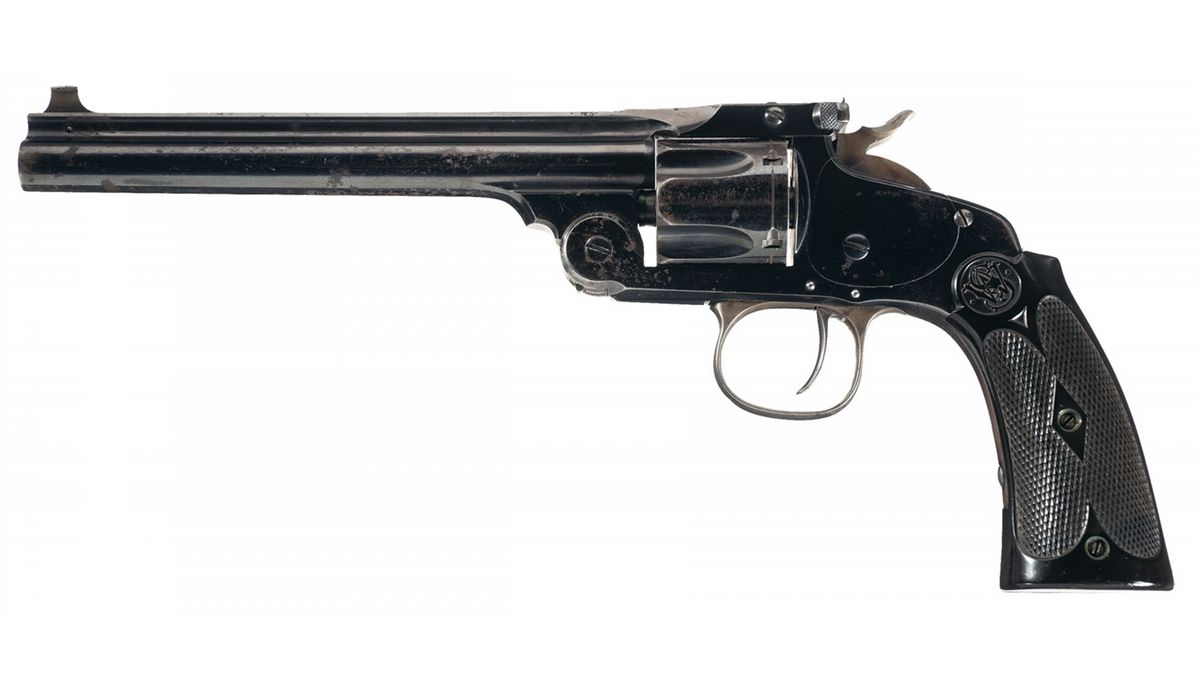 Introduced in 1891 with this scarce target example having a 6 inch barrel. The revolver has the special order target sights consisting of a pinned blade front sight and adjustable notch rear sight on the barrel latch with wide casehardened checkered hammer. The top of the barrel rib is stamped with the two line Springfield address/patent dates marking. The matching serial number is on the butt and rear face of the cylinder with barrel latch unmarked. Blue finish with casehardened hammer and trigger guard. The revolver is fitted with checkered grips featuring the S&W monogram imprinted at the tops.