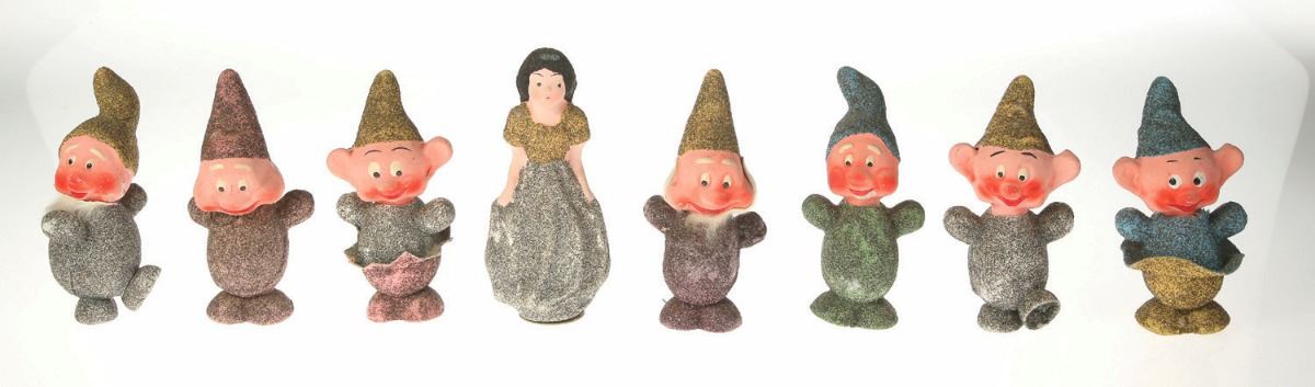 (Walt Disney Productions, 1938) These (8) figurines from Walt Disney's "Snow White and the Seven Dwarfs" were an officially licensed product created in Germany shortly after the release of the animated feature film. Featured are all of the dwarfs as well as Snow White. They could serve as tree ornaments, as well as candy containers. Constructed of paper mache and mica. Snow White measures 6" tall while the dwarfs measure 5.5" tall. Set is in very good condition, with minor wear on a few of the dwarfs, and a 1" diameter damaged piece on the back of Snow White.
