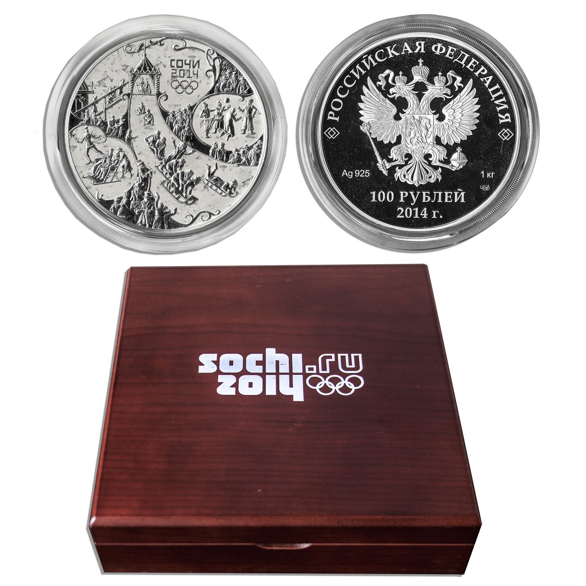 Incredibly scarce Sochi 2014 commemorative silver coin, ''Russian Winter'', with a face value of 100 Rubles. As one of 54 minted to commemorate the games, the coin's issue was very limited, totaling less than half of the number issued for the London 2012. Front of medal depicts the National Coat of Arms of the Russian Federation, a two-headed spread eagle with wings up crowned with two small crowns with a semicircular inscription along the rim reading ''THE RUSSIAN FEDERATION'' in Russian. With inscriptions to lower left indicating the precious metal and its fineness, and to the right, the fine metal content and the mint trade mark, and to lower edge ''100 RUBLES'' in Russian and the date: ''2014 r.'' Verso is engraved with winter leisure sports custom in Russia, including at center, people sledding down a slope, to the right, people having a snowball fight, and to the left, people ice skating. Inscription at the top reads ''SOCHI 2014'' in Russian in two lines and the depiction of five Olympic rings is beneath it. Includes official COA reading, ''This is to certify that the coin accompanied by this certificate is original, issued by the Bank of Russia and minted by the Mints of the Russian Federation. Metal: Silver / Fineness: 925/1000 / Denomination, Roubles / 100 / Fine Metal Content, KG: 1 / Quality: Proof-like / Diameter. MM: 100,0''. With an official Sochi hologram sticker including serial numbers affixed to COA. Coin weighs 2.6 lbs and measures 4'' in diameter. Housed in original and ornate wooden box measuring 7.25'' x 7.25'' with ''Sochi 2014'' printed in silver to cover and again to inside of box. Fine.