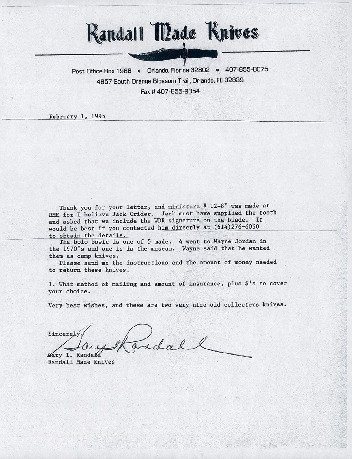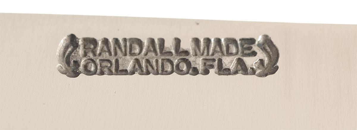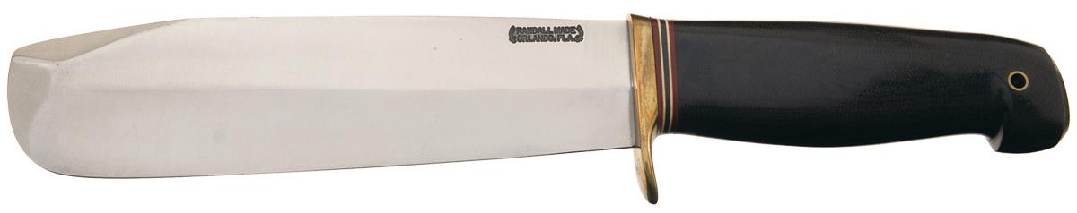 Produced in the early 1970s, this special order Randall bolo knife has a 7 inch blade marked with the scimitar flanked Orlando address making. Brass finger guard with micarta handle. In the included photocopied Randall letter, Gary T. Randall states that only 5 of these bolos were produced with 4 going to Wayne Jordan and 1 going to the museum. OAL: 12 3/4".
