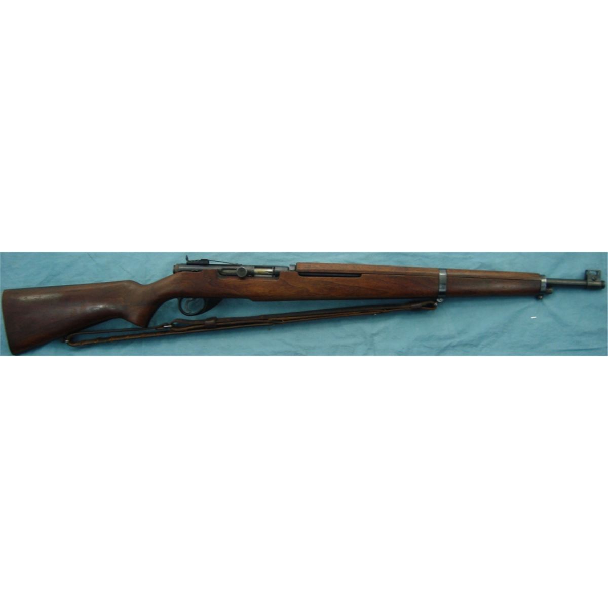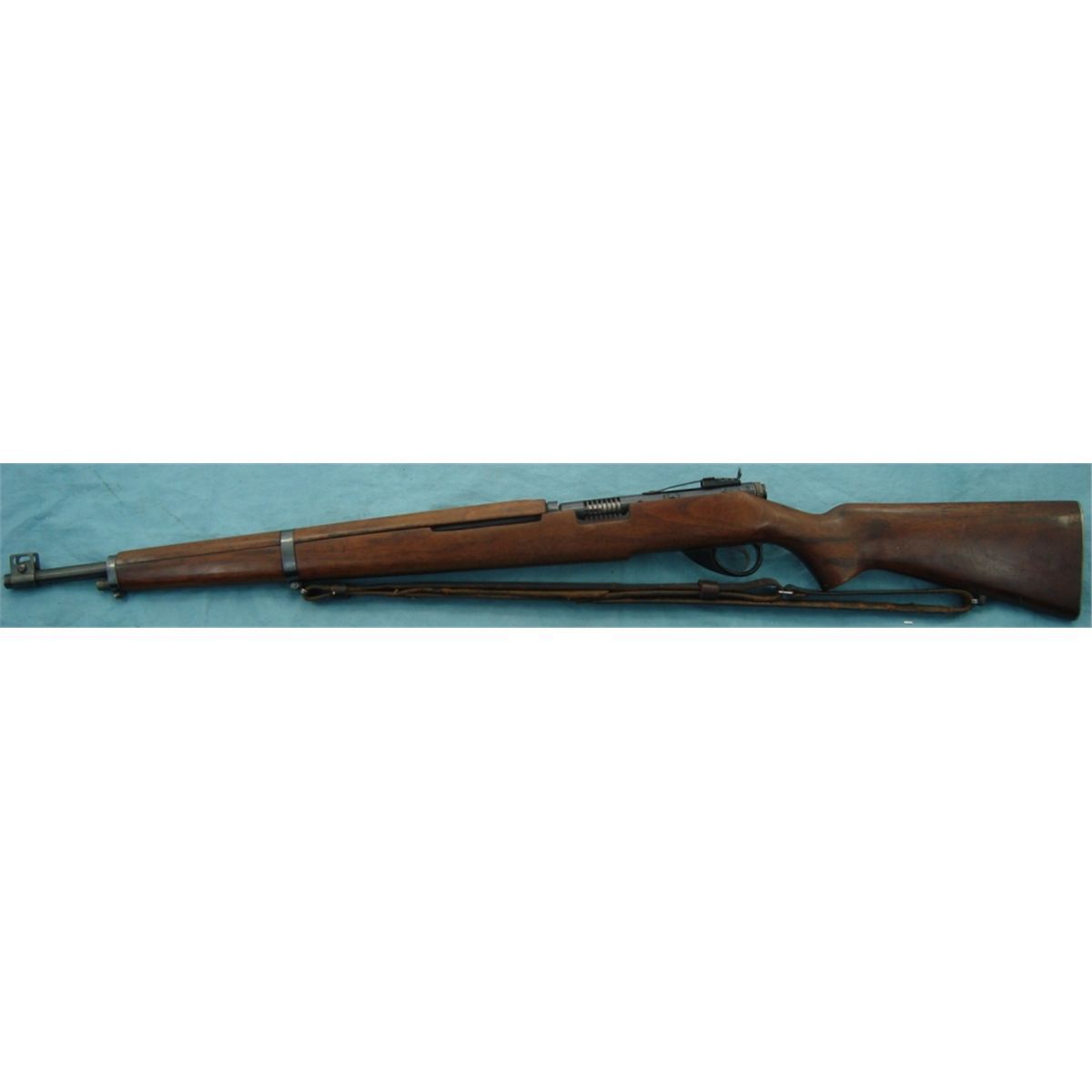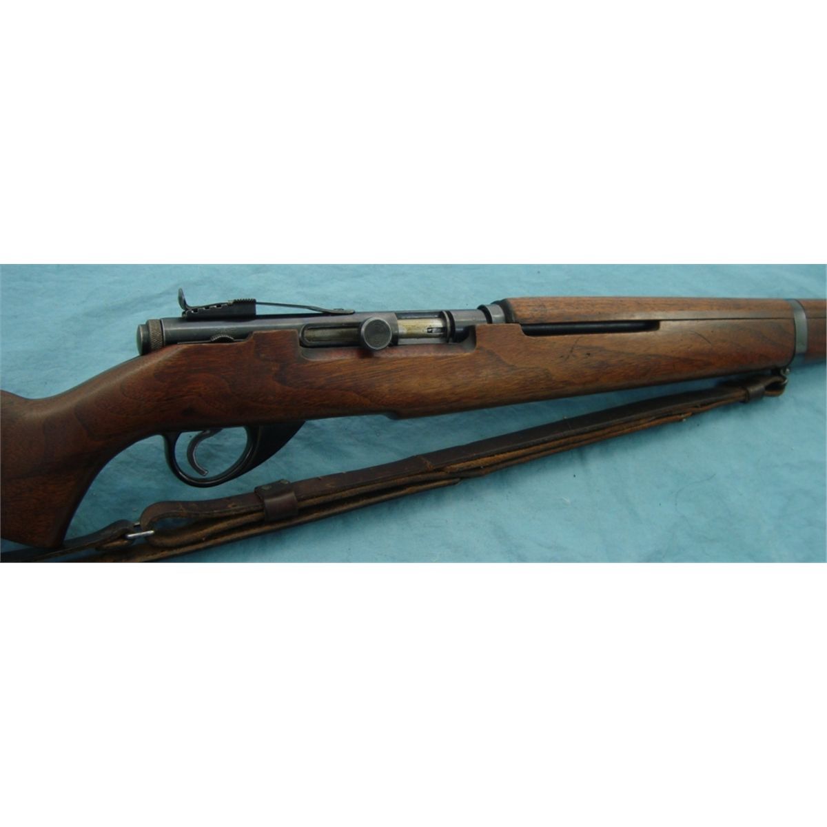 #NSN; 22 cal. w/full military style wood & front sight. It was made to resemble the M-1 Garand Military Rifle. Tube feed w/metal military style butt plate & leather sling. In very good overall condition.