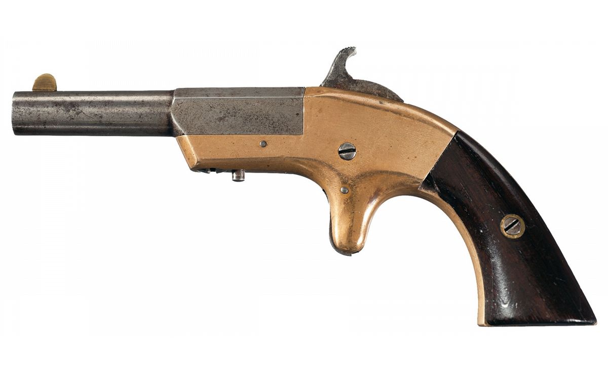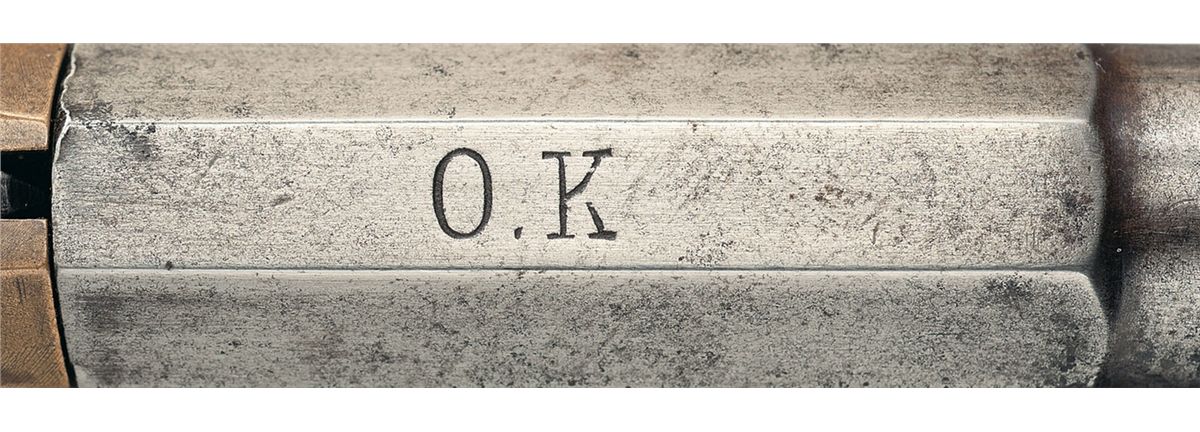 These Derringers were manufactured between 1863 and 1870 with an estimated 6,000 produced. The top of the barrel is marked "O.K" with the serial number "1284" marked on the butt and underside of the barrel. Fitted with a pair of smooth rosewood grips.
