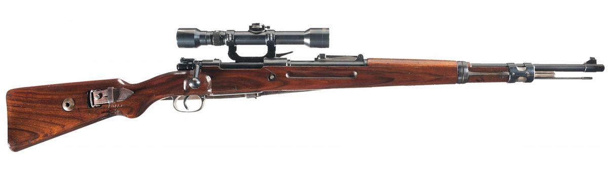 This is an excellent example of a early prewar Mauser K98 Standard Model rifle that was made as a short side rail style sniper rifle. These prewar commercial standard models were the first true K98 style Mauser rifle that was the forerunner for all later wartime production rifles. It is has the large "Mauser Banner" logo on top of the front receiver ring with an unmarked rear bridge.The left side of the rear section of the barrel and receiver are both numbered "B76652" and the receiver has the additional prewar commercial, Crown over "B, U and G" proofs as well as the standard Crown over "N" nitro proof. The top of the bolt also has the prewar commercial Crown over "B and U" proofs. Matching numbers on the barrel bands, trigger guard and floor plate and complete bolt assembly. This particular example has a short side style sniper rifle that has the late (1942 era) Type Three scope base and mount, (the latter numbered to the gun). The base is fitted with three main screws, three locks screws and two taper pins. The mount is also a late model that has a commercial 4 power rifle scope that is marked on the rear ocular eyepiece; "DIALYTAN 4X/Nr.61753". It is equipped with the first pattern "H" front barrel and the later pattern wide middle barrel band, which is numbered and proofed with a small "S/237" and Waffenamt/"26" proof, (the only military proof on the entire rifle). The barrel is fitted with the standard tangent military rear sight and inverted "V" front sight. Mounted with the correct prewar Standard Model pattern stock with the finger grooves on the sides, flat butt plate, take down washer through the butt with the lower sling swivel (behind the pistol grip) fitted with field walnut insert, as this was not considered the K98 style. It is complete with an original WWII leather sling and cleaning rod. In their popular book on the German sniper, both Richard Law and Peter Senich show that the Standard Model was the early choice for conversions to siderail snipers in the crisis of 1942 on the Russian Front. The period (old) alteration of the stock verifies the conversion by Army contract (the commericial swivel attactment was plugged at an arsenal for conversion to military use.) (The aforementioned statement is the opinion of experts and could apply to this rifle, although we have no proof.)