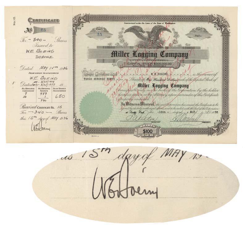 WILLIAM E. BOEING (1881 - 1956). Pioneer aircraft manufacturer. He formed the Boeing Airplane Company in 1916 and Boeing Air Transport in 1927, later merging with several other companies to form United Aircraft and Transport Corporation which dissolved in 1934. Washington, 1936. Stock certificate for 340 shares of the Miller Logging Company issued to and signed on the stub by Boeing. Black/Green. Vignette of a spread-eagle. Litho. The lumber company was in all likelihood held and run by Boeing to provide the necessary wood for the construction of his airplanes. This is one of only a dozen certificates of this type signed by Boeing. Pen cancellation not affecting Boeing's signature. An important addition to any aviation collection. Extremely Fine.