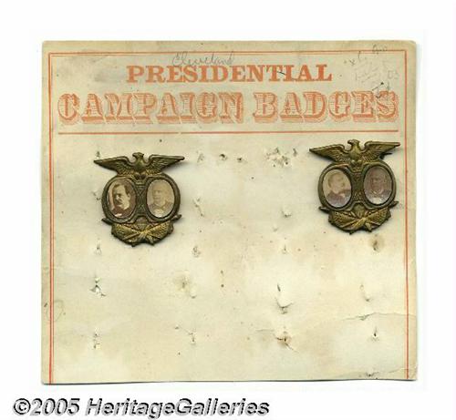 <B>Rare Store Display Card with Two 1892 Grover Cleveland - Adlai Stevenson Jugate Pins</B></I> Interestingly, each has a different Cleveland portrait, but apparently were sold this way, as these two pins have identical patinas, and are clearly original to the card. Condition of the pins is excellent, while the card shows light "aging," and has been trimmed at the bottom. 1892 Cleveland jugates are much scarcer, and pricier, than those with his 1884 and 1888 running mates, Thomas Hendricks and Allen Thurman. These store display cards are much in demand, especially with such desirable attachments. Size 5.5" x 5". Lot:260