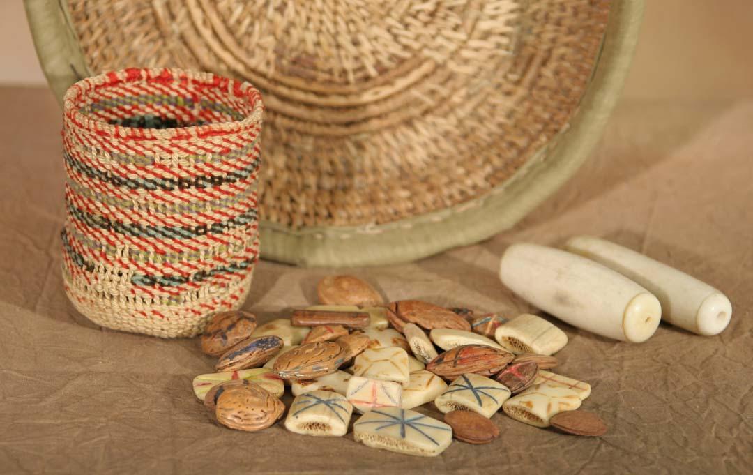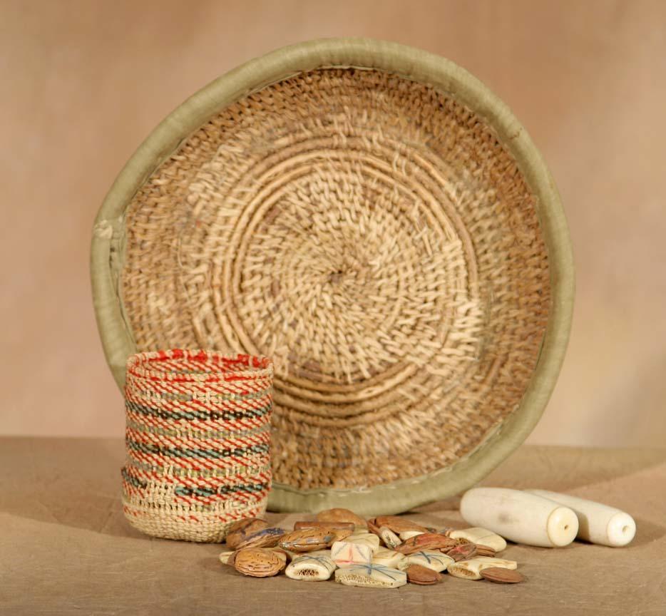 Suquamish Gambling Game. Consisting of 21 bone pieces, 16 nuts & 2 baskets. Pieces range in size from ½" - 3 ¼". Baskets measure 2" x 9 ½" & 2 ½" x 3". Early 20th century. (est $400-600). Provenance: Ex-Santa Fe, NM., Estate. For condition reports please visit: www.auctioninsantafe.com/cr2011.pdf