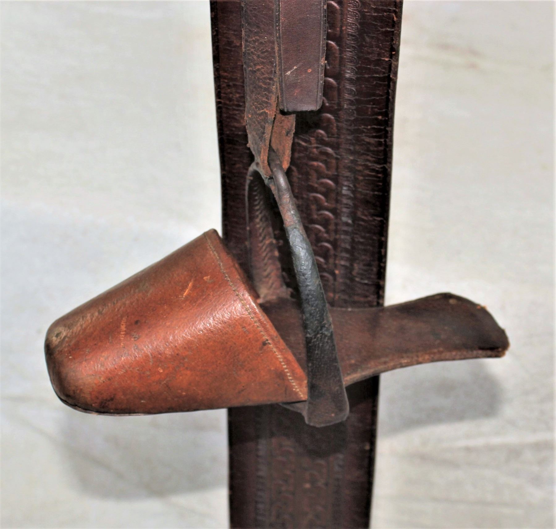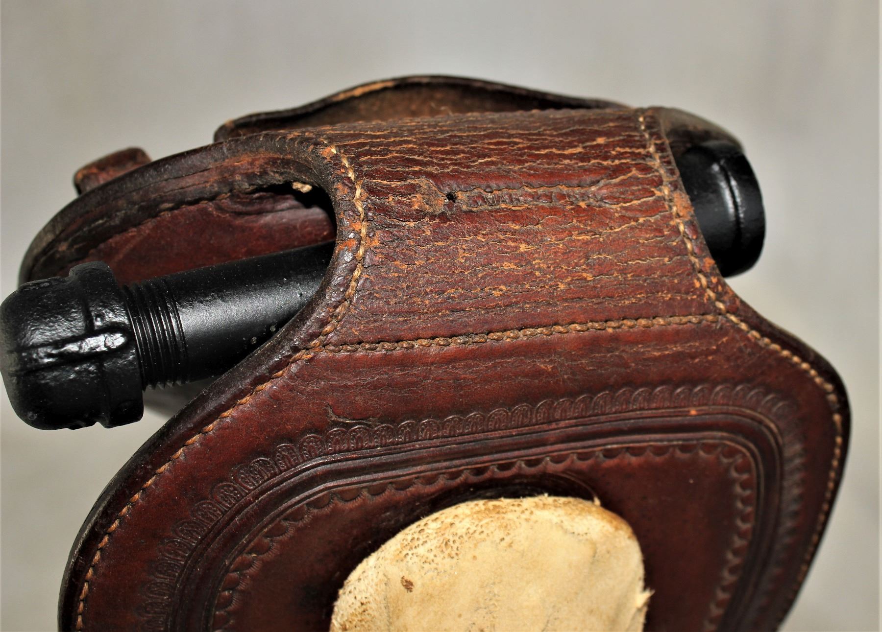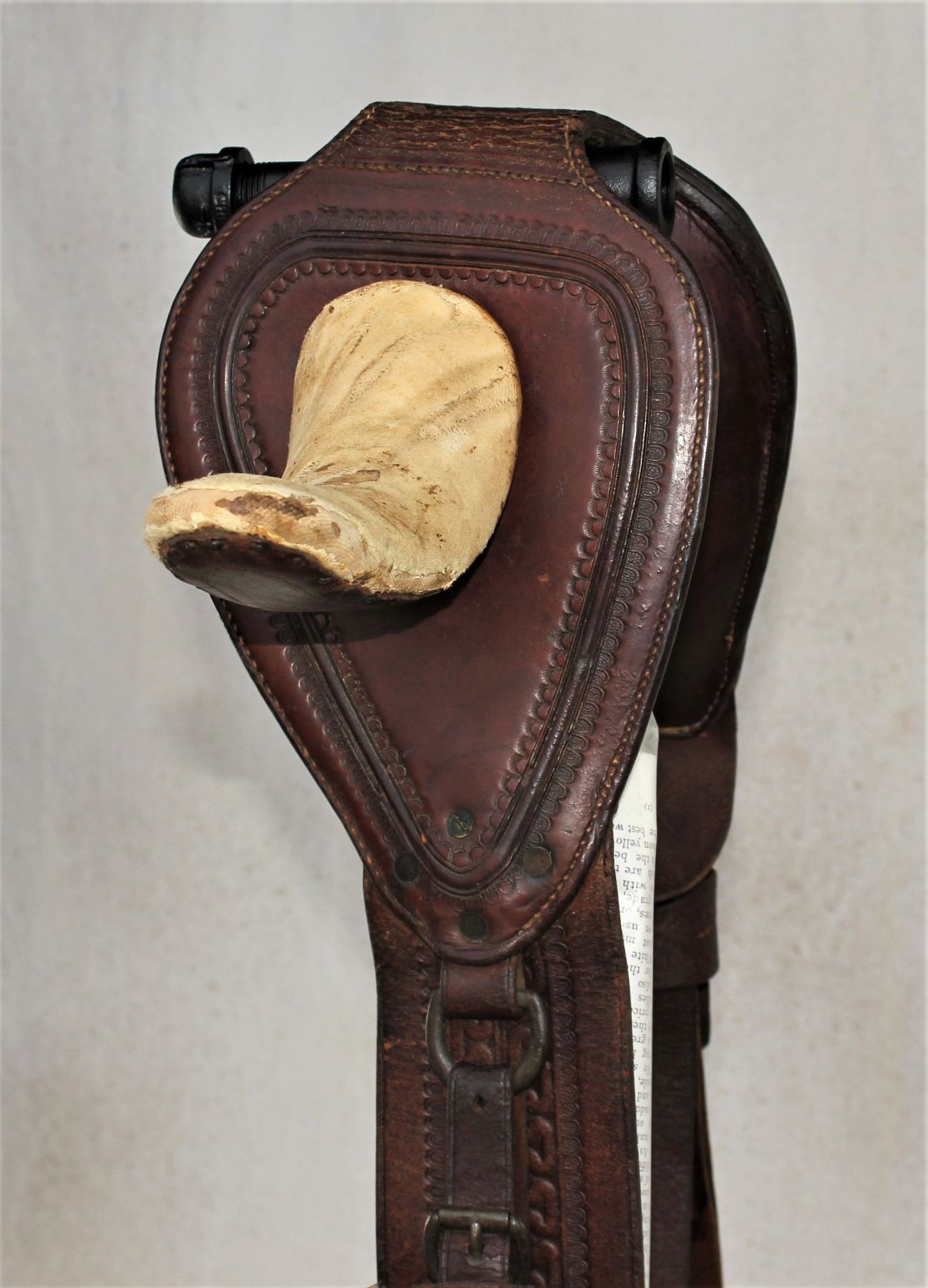 Extremely uncommon saddle accessory used by cowgirls as a fashion of side saddle. In nice condition, with light color.