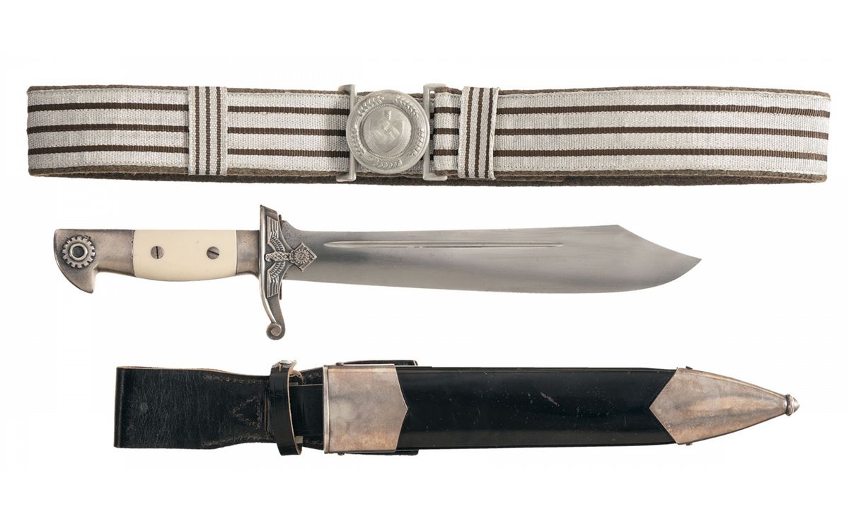 Founded post-WWI out of a group of mustered-out army engineers, Technische Nothilfe (TeNo) was later absorbed by the Order Police, indirectly becoming the Engineering Corps for the SS. In addition to national disaster response, TeNo was also responsible for cleaning up captured areas in the wake of Nazi occupation, and restoring essential services following bombing raids. Though the organization was very large, only the small number of full time subordinate members were able to receiver the hewer. The blade is 9 3/4 inches with a single fuller clip point with Nazi "eagle/swastika" with "GES/GESCH" on either side of the eagle over the original Eickhorn/Solingen logo all on the left side. Nickel finished handle, with the TeNo Nazi eagle on the cross guard, stylized gear on the pommel, and smooth white plastic grips. Black enamel painted scabbard, with nickel finished tip with the number "5642" marked on the throat, and a black leather belt hanger with gate clip. Comes with a wire wrapped silver braided belt with "RAD" type belt buckle with swastika over shovel head.