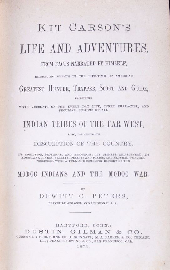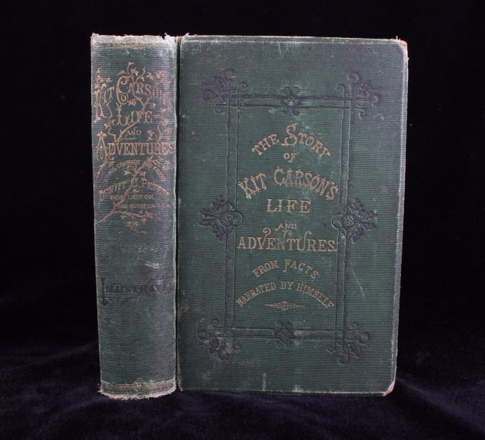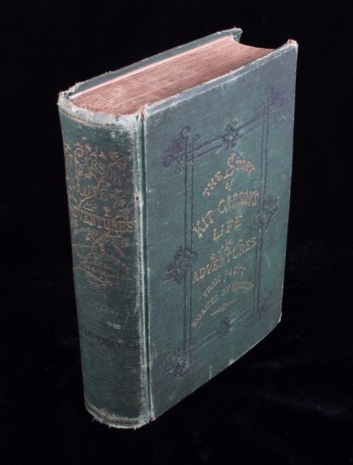 This lot features a rare copy of The Story of Kit Carson's Life and Adventures From Facts Narrated By Himself. Authored by Dewitt C. Peters, one of Carson's friends and comrades, the novel gives a inside look to one of American's most iconic adventures. Published by the Queen City Publishing co. in 1875. The book is in good condition for its age. Measures: 9" H x 6" W x 1 3/4" D