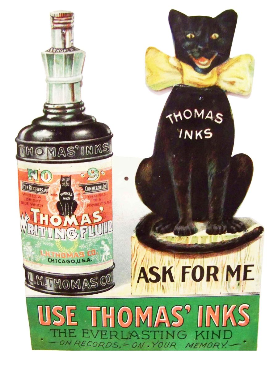 Rare Thomas Inks Black Cat Die Cut Embossed Tin Sign. The cat's head and bow tie have been completely restored the remainder of the sign is original. Good condition. 7 X 9 1/2 inches.