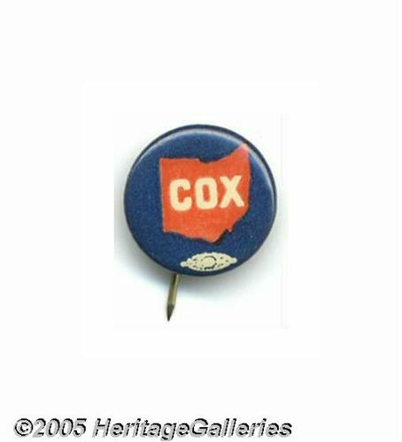 <B>Rare Tiny 3/4" James M. Cox Pinback Ohio Map</B></I> Probably a 1920 issue touting his Ohio origins, as it is similar in coloration and style to other known 1920 Cox buttons. Very scarce, and in great condition. Lot:262