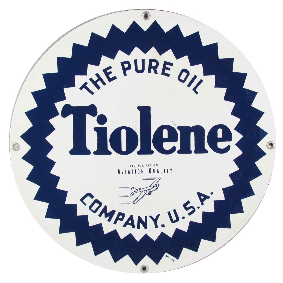 Rare Tiolene Porcelain Sign. The Pure Oil Co. Aviation Quality. Depicts an airplane. Near mint condition. 15 inch diameter.