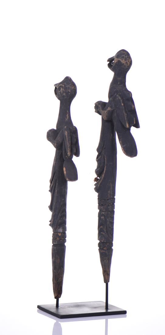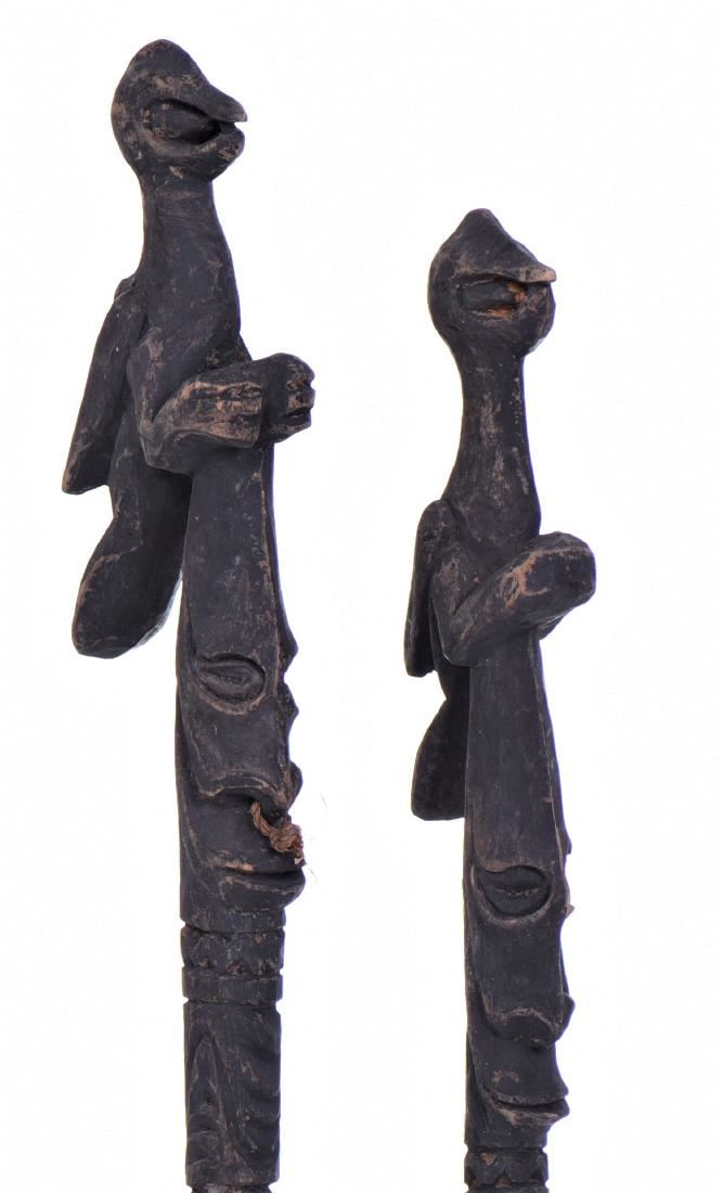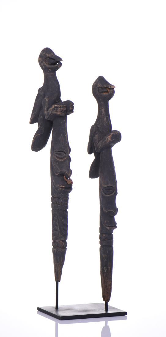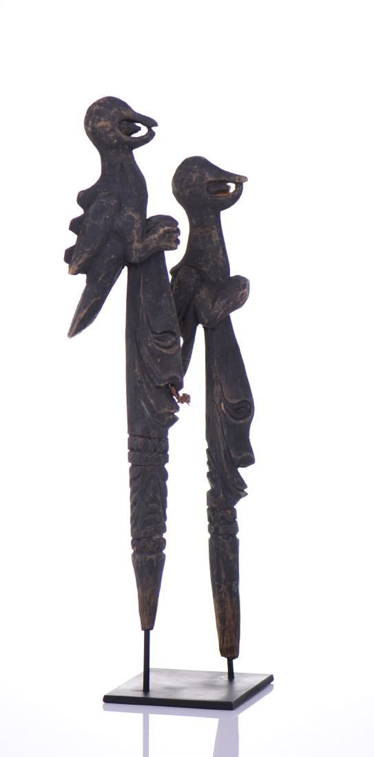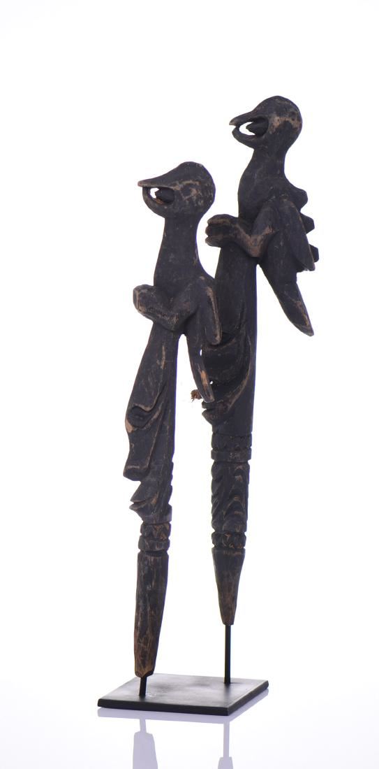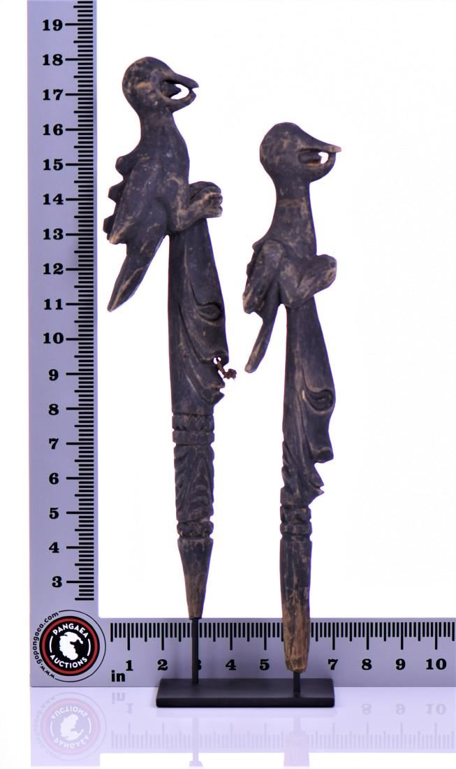 Rare Two African Asmat Family Crest Totems, New Guinea. The Asmat are an ethnic group of New Guinea, residing in the Papua province of Indonesia. The Asmat inhabit a region on the island's southwestern coast bordering the Arafura Sea. Field Collected 1945. Provenance: Ethnographic Tribal Museum Collection (See Auction Catalog Description). Some Lots Have Been On Exhibition And Have A Custom Made Metal Stand Specifically Designed To Fit The Work. Estimated more than 75 yrs old. Oceanic art is the creative works made by the native peoples of the Pacific Islands and Australia, including areas as far apart as Hawaii and Easter Island. Specifically it comprises the works of the two groups of people who settled the area, though during two different periods. The area is often broken down into four separate regions: Polynesia, Micronesia, Australasia, and Melanesia. The artistic creations of these people varies greatly throughout the cultures and regions. The subject matter typically carries themes of fertility or the supernatural. Art such as masks were used in religious ceremonies or social rituals. Petroglyphs, Tattooing, painting, wood carving, stone carving and textile work are other common art forms. Size and/or Weight: See Measurement Photo. (Photos Represent The Lot Condition.)