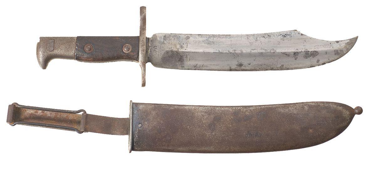 This rare Krag Bowie bayonet features a 9 inch blade with a clip point blade. The right ricasso is marked "US" with the date "1900" on the left. The hilt is of the standard Krag pattern and the grips are smooth two piece walnut. Complete with an original Krag Bowie metal scabbard, which features the distinct ball tip and metal belt swivel.