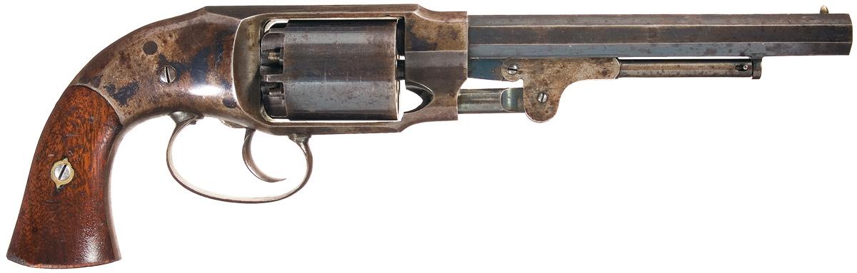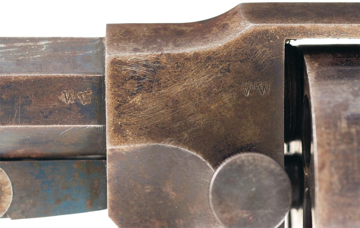This is an example of a U.S. Martially Inspected Army Model Pettengill double action revolver. 2,000 of the 3,400 produced were delivered to the Ordnance Department and the revolvers were issued to several Federal Cavalry regiments during the Civil War. The barrel has a brass cone front sight and the frame has a sighting groove. The revolver has a 6-shot un-fluted cylinder and hammerless frame. The top strap is marked: "PETTENGILLS / PATENT 1856" on the right side of the sighting groove and "PAT' JULY 22 1856 / JULY 27 1858" on the left side. The bottom of the frame ahead of the trigger guard is marked "PATENTED / NOV 4, 1862". The left barrel flat at the breech and the left side of the frame ahead of the cylinder are marked with "W W" inspection marks, "W" on the left side of the loading lever, a "D" on the bottom of the frame, and "WW" on the cylinder. The matching serial number is marked on the butt and cylinder. The revolver is fitted with two piece walnut grips with a faint boxed cartouche on the left panel and a "W" on the bottom of the each panel. Comes with a typed history of the Pettengill revolver from a noted authority/collector, Loren M Pattengill, dated July 27, 1964.