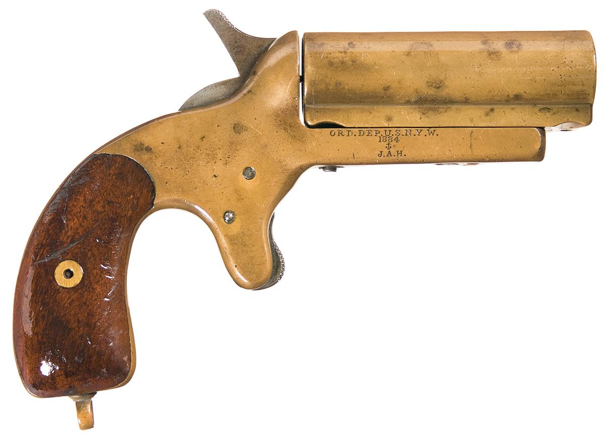 This is the first U.S. cartridge flare pistol to use a paper flare cartridge. These pistols were manufactured at the U.S. Navy Yard at Washington, D.C. (USNYW) with about 100 produced between 1882 and 1884. This pistol is marked "ORD.DEP.U.S.N.Y.W. / 1884 / anchor / J.A.H." on the right side of the brass frame. The brass barrel is correctly attached to the frame by a loose fitting screw at the barrel midpoint. The barrel pulls forward of the frame and swivels 360 degrees for loading and unloading, which can be done at either the breech or muzzle end of the barrel. Matching serial number on barrel, frame, and right grip, with the number "12" on the left grip.