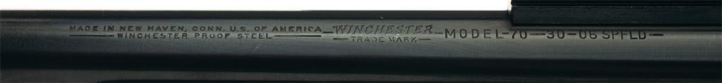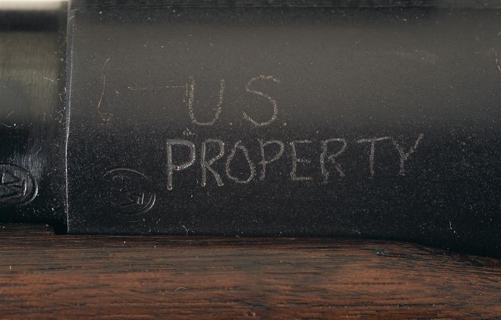 This example was manufactured in 1957. There is a sight block mounted at the muzzle end of the barrel and towards the rear of the barrel is a scope block. There is also a scope block mounted on the receiver ring and a sight bracket mounted on the left rear of the receiver. There is a set of Redfield International Match sights mounted on the front sight block and on the rear sight bracket. There is a "W/P" in an oval proofmark on the left breech end of the barrel and on the front of the receiver. "U.S./PROPERTY" is electropenciled by the proofmark on the receiver. The electro-penciled U.S. Property markings are identical to the markings found on U.S. Winchester 52C rifles purchased by the military in the late 1950s. The front receiver ring is matted, the receiver bridge is factory tapped for a scope base and the tang is the "straight" version. The bolt body is polished bright with the bottom marked with the matching serial number "409541". The left side of the barrel is roll-stamped with the Winchester proof steel markings, "WINCHESTER/TRADEMARK" and "-MODEL-70-30-06-SPFLD". Rifles similar to this were purchased for Marine Corps and Army rifle teams during the 1950s. The Model 70 Target Model Rifles were utilized as sniper rifles by both the Army and Marines during the Vietnam War. On page 165 of "THE COMPLETE BOOK OF U.S. SNIPING" by Peter R. Senich shows 3rd Marine Division snipers firing Model 70 Target Model rifles on the range at Da Nang, Vietnam in January of 1966. On page 163 Senich describes how the 3rd Marine Division Rifle Team Model 70 rifles with target stocks were shipped to Vietnam for issue to Marine snipers. Army and Marine use of Model 70 Target Model rifles is also documented by Senich in "THE LONG RANGE WAR" and "ONE SHOT WAR". Due to their extensive use as sniper rifles during the Vietnam War, examples of U.S. marked, 1950s production Model 70 Target Model rifles are rare. Mounted on a smooth marksman style black walnut pistol grip stock with accessory rail and checkered steel buttplate.