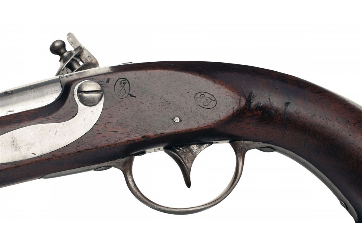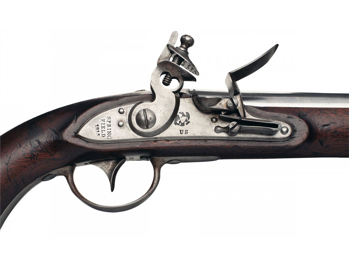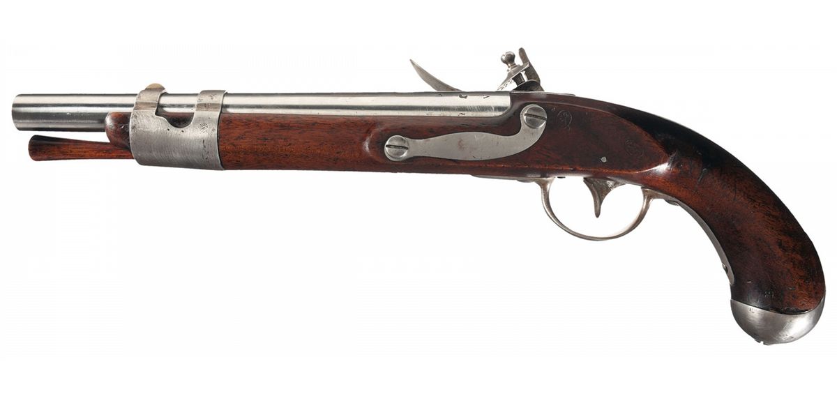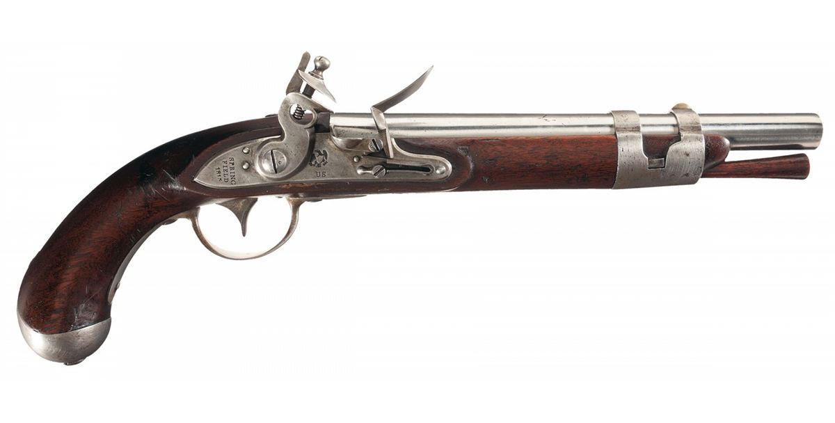 This is an example of one of only 600 Type II Springfield Model 1817 martial pistols, and one of a few that had the 1815 dated lock. In the book HISTORICAL PISTOLS, Smith and Bitters state that their were less than 10 1807s with an 1815 lock. Springfield Armory only manufactured a total of about 1,000 of these pistols in Type I and the Type II with part of them made circa 1807-1808 and the balance 1817-1818. Production was stopped in 1808 when the massive 69 caliber was found no longer suitable and the small 54 caliber was was being adopted for production at Harpers Ferry. Many of the parts were kept in storage at the armory. In 1817 the pistol project was started up again under the initiative of Colonel Robert E. Lee who was the Superintendent at Springfield Armory. These locks were left over from parts of the Model 1803 (Harpers Ferry Type) half stock rifles that Springfield Armory began production on in 1814 and halted in 1816. These locks were about identical to both the second production, post 1814, Model 1803 Rifle and the Second Type 1817-1818 production Springfield pistol. They were already marked, dated and subsequently used on Model 1817 pistols. This pistol has the Type II features of an evenly rounded rear of the lock without the projection, straight toe on the frizzen with an evenly rounded top, long bulbous, rounded finial on the frizzen spring and reinforced double neck hammer. The lock is marked "SPRING/FIELD/1815" behind the hammer and eagle over "US" ahead of the hammer. The barrel is dated "1818" with a recessed "P" and "eagle head / V" proofs marked on the left side breech end of the barrel. The trigger guard plate is marked with an "RS" (Robert Sloan). Brass blade front sight, iron mountings, wooden ramrod with swollen head and mounted with a full walnut stock with two sharp oval cartouches on the left flat and the letter "B" on the lower left side. The Model 1817 pistol is the first of only three handguns ever manufactured by Springfield Armory which also include the Model 1855 pistol carbine and the U.S. Model 1911 45 automatic.