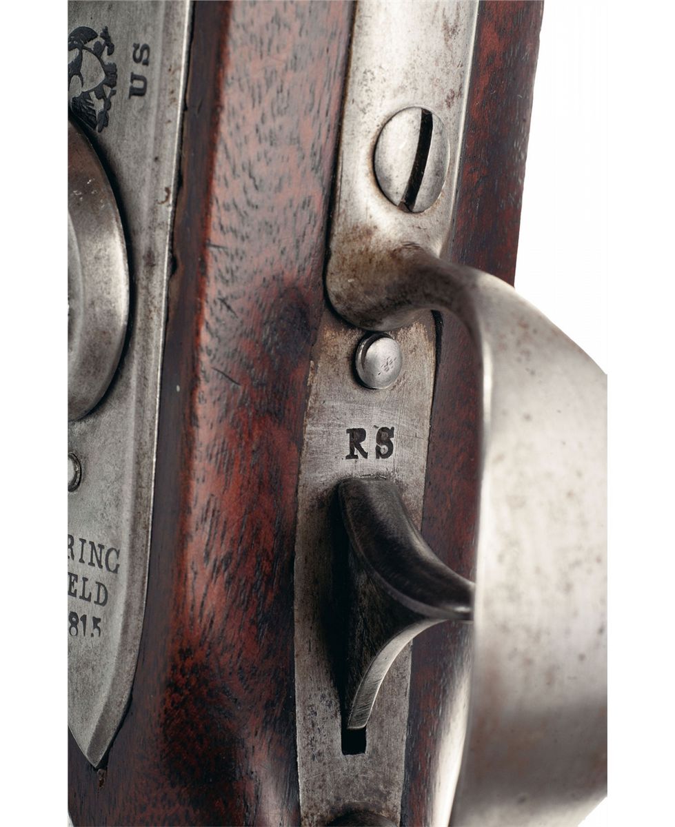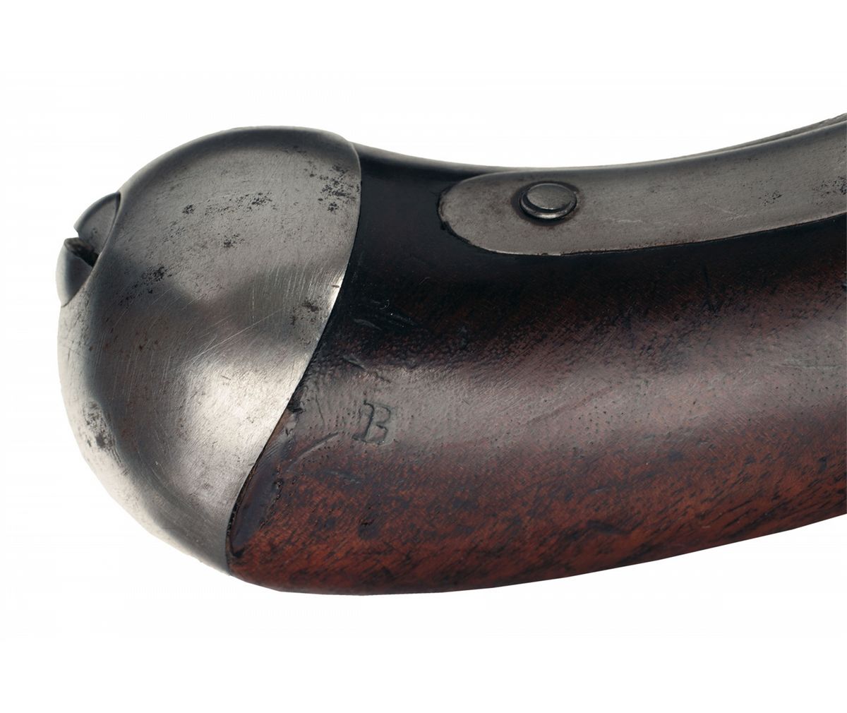 Condition: Very fine. The barrel and barrel tang retain a bright appearance. The remaining surfaces have a smooth silver gray patina. The stock is also very fine with crisp original cartouches, a few minor scattered dings and scratches. The flats remain sharp. The "P" proof on the barrel was a weak stamp, otherwise the markings are very fine. The action is excellent.