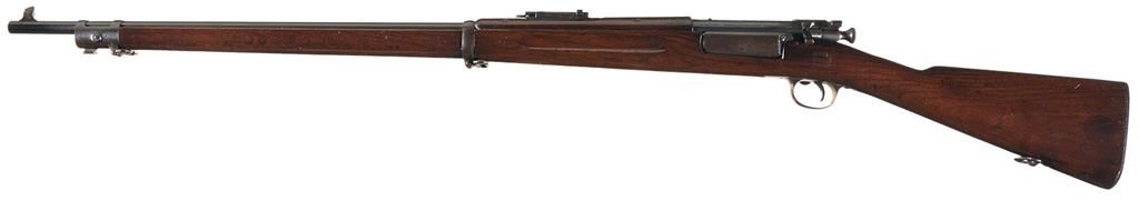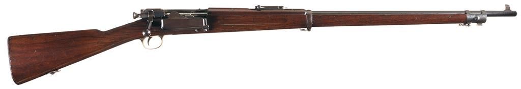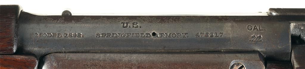 The is a rare example of one of only 841 Model 1898 Krag .22 caliber Gallery Practice rifles manufactured by Springfield in 1906-1907. The rifle has the distinctive altered receiver side showing the small hole for the ejector, with the correct 22 caliber barrel with off-set chamber and bolt with auxiliary extractor for the .22 Long cartridge. The receiver is marked "U.S./MODEL 1898. SPRINGFIELD ARMORY, 476317" followed by "CAL./.22" that was applied only to the Gallery Practice rifles. Ramped blade front sight and adjustable ladder rear sight graduated 1 to 20. Mounted with a smooth full walnut full stock with matching handguard with bayonet lug and stacking swivel on the front barrel band, a clear boxed "JFC" cartouche on the left side, and circled script "P" proof in the pistol grip area behind the trigger guard. It is fitted with sling swivels and steel buttplate with compartment.