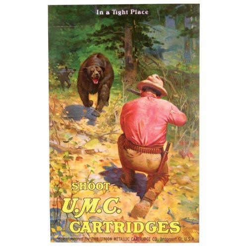UMC Cartridges Paper Sign. Mfg. by The Union Metallic Cartridge Co., Bridgeport, Conn. USA. Entitled In A Tight Place, artist Evertt Johnson. Depicting man shooting black bear. Original bands top and bottom. Framed under glass in period oak frame. Slight wrinkles on left side, otherwise very good condition. 15 1/4 X 24 inches image only.