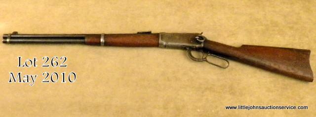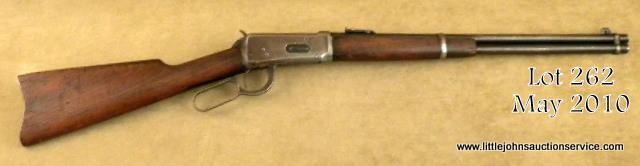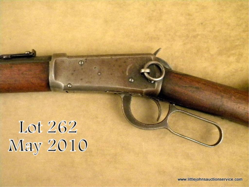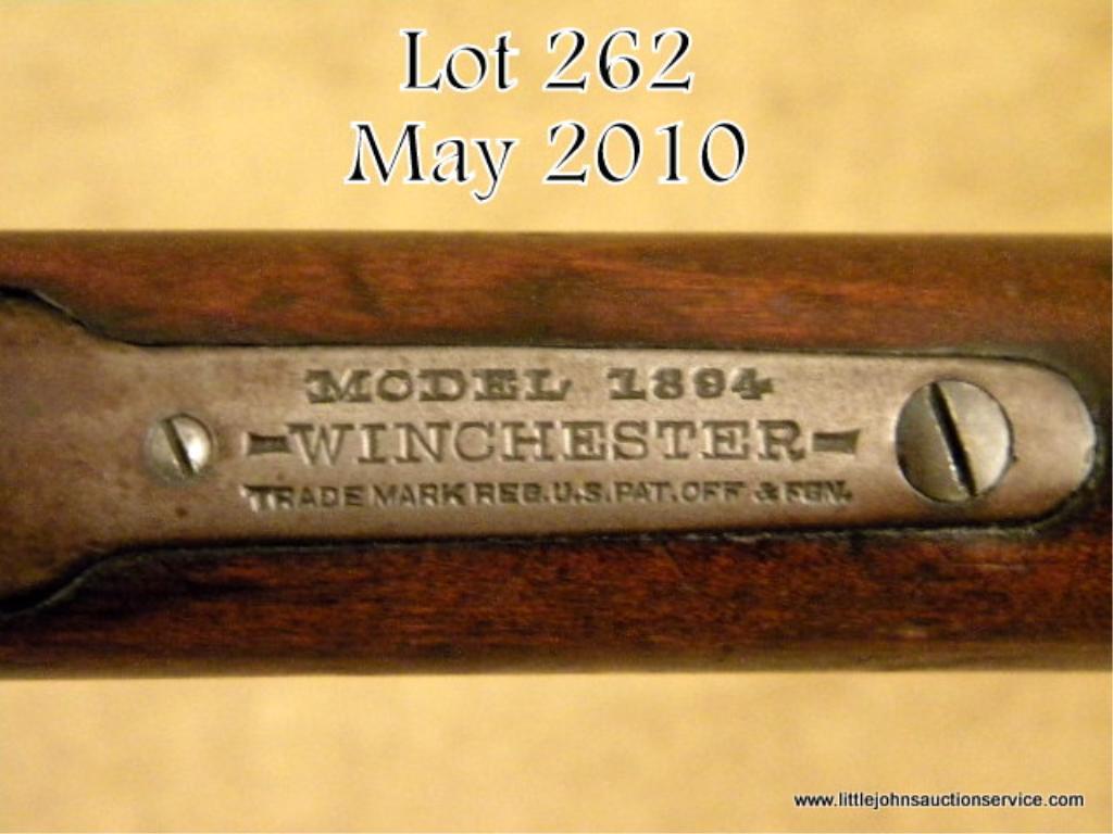Rare US and flaming bomb proofed Winchester Model 1894 lever action saddle ring carbine, blue finish, wood stocks, #844858. This gun is in overall good condition showing liberal traces of muted original finish on the barrel and loadingtube mixed with a plum brown patina and a brown patina on the receiver with some blue in protected area around the back of the saddle ring; overall good bore, action and markings; wood stocks are overall good with numerous scattered nicks, marsand scratches from carry and storage. According to “The Winchester Book” by George Madis (p. 442), these types of US marked ‘94s saw duty guarding the U.S. borders, defense plants and some were with the A.E.F. “doughboys” when they landed inFrance. Given this gun was likely issued in 1919, it conceivably could have been in use along the Mexican border. Consignor indicates discussion with Cody Firearms Museum in Cody, WY highlighted probably cavalry issue, possibly to Fort Davis but no written documentation to this theory was available from Cody. A great variation of the classic ’94 SRC. Est.: $1,000-$1,500.