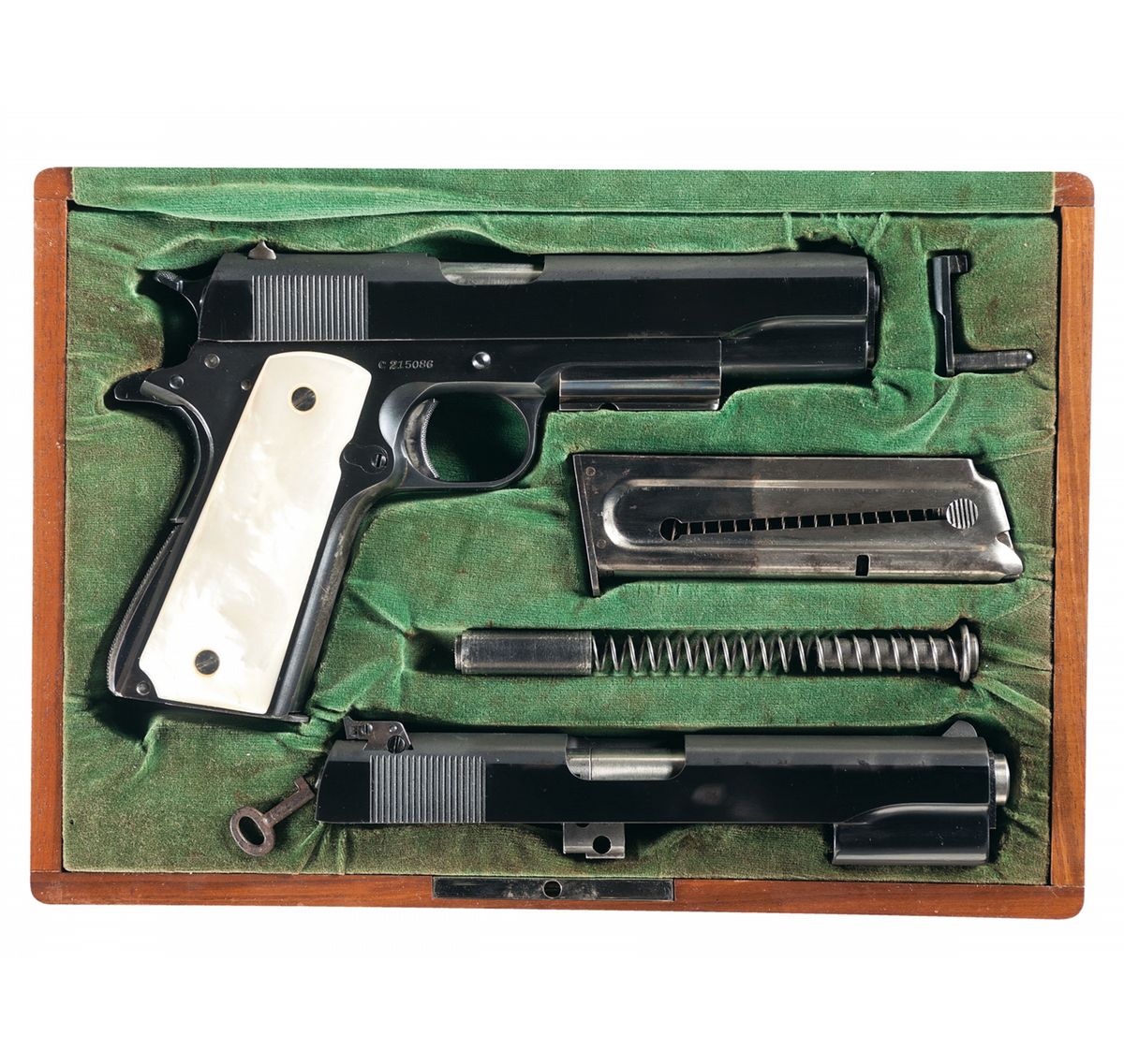 This is a very rare and certainly unique one of a kind late cased pre-war/post-war Colt Government Model pistol as possibly assembled throughout World War II in early 1946. This unique/rare pistol set is complete with an original matching numbered, 22 cal Colt Service Model/ACE conversion kit with spare barrel and magazine all stored in an original Colt factory walnut display case. The serial number of this frame place the manufacture in late 1942, just when the Colt factory was starting to transition into their heaviest U.S. Army M1911A1 contracts. It is interesting to note that in Charles Clawson's book on Colt M1911A1 pistols he speculates pistols in this serial number range as being made into "cutaway" pistols, obviously that is not the case in this instance. (The actual item always trumps speculation!) The only Colt factory markings or proofs on the entire pistol and conversion kit are the serial numbers, "C215086". The top of the frame around the disconnector hole does have a single letter "G" that was a Colt factory/U.S. Government provisional inspector stamp, along with the matching serial number (215/086) above and below the firing pin hole, exactly as numbered on prewar and early WWII M1911A1 automatic pistols. Additional, although being a very late pre-war manufactured frame it does not have the Schwartz safety, so frequently found on early WWII frames. A very unique feature of this pistol is that on the underside of the frame extension, there has been a factory made single dovetailed under lug installed identical in concept to what you see on many M1911A1 style frames today. This under-lug comes with a factory made/machined 4.25 inch long rail extension that slides onto the under-lug and is secured in place with single locking lever on the right side. The underside of this rail extension has been milled out and was probably originally fitted with some type of barrel weight (now missing) that was very popular at this time. The under-lug and accompanying rail were all professionally/factory made and both have an original Colt factory blue finish. As noted this very unique pistol is accompanied by an original late Colt factory 22 cal Service Model/ACE conversion kit with the floating chamber. The slide is also void of any Colt factory markings or proofs and is numbered on the underside of the right rail with the matching frame serial number (215086). The slide is fitted with the late pre-war style target front sight and "Stevens" National Match" style adjustable rear sight. This conversion kit is complete with the correct magazine, extractor, spare recoil spring, guide assembly and slide stop pin. This entire lot is accompanied with three original Colt, 22 cal, spare barrels, a spare 22 cal magazine, a set of grips, (one plastic and one wood) an original 1938 dated Colt factory advertising book, as well as the original Colt factory French fitted walnut display case. The blue finish on the actual pistol, accompanying 22 cal conversion kit and various accessories are all the early post-WWII, 1946/47 type Colt commercial blue finish with the matte finish on the top sections of both slides. It is certainly clear to us that this is an original Colt in-house assembled set, probably made from left over WWII contract and pre-war parts made for one of the senior Colt employees for his personal use.