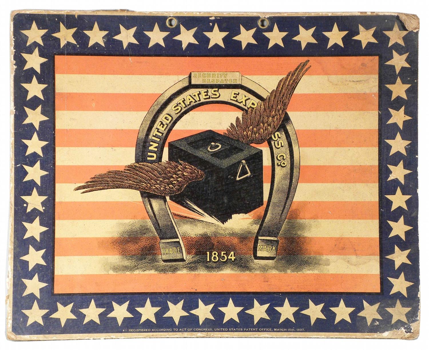 Extremely Rare United States Express Co. Hardboard Calling Card, two sided. Trade Mark 1854, Security Dispatch. Registered according to the act of congress, United States Patent Office March 15, 1897. Couple of dog eared corners, minor creasing and discoloration on one side otherwise very good condition. 18 1/8 X 14 1/2 inches.