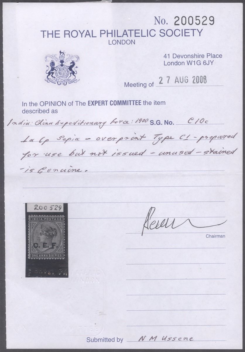 Queen Victoria, 1900,C. E. F.Overprint, One Anna Six Pies, Sepia,PreparedBut Not Used,Mint,CertifiedByRPSLLondon,Certificate No. 200529, dated27thAug 2008,SG#C10c,Extremely Rare.