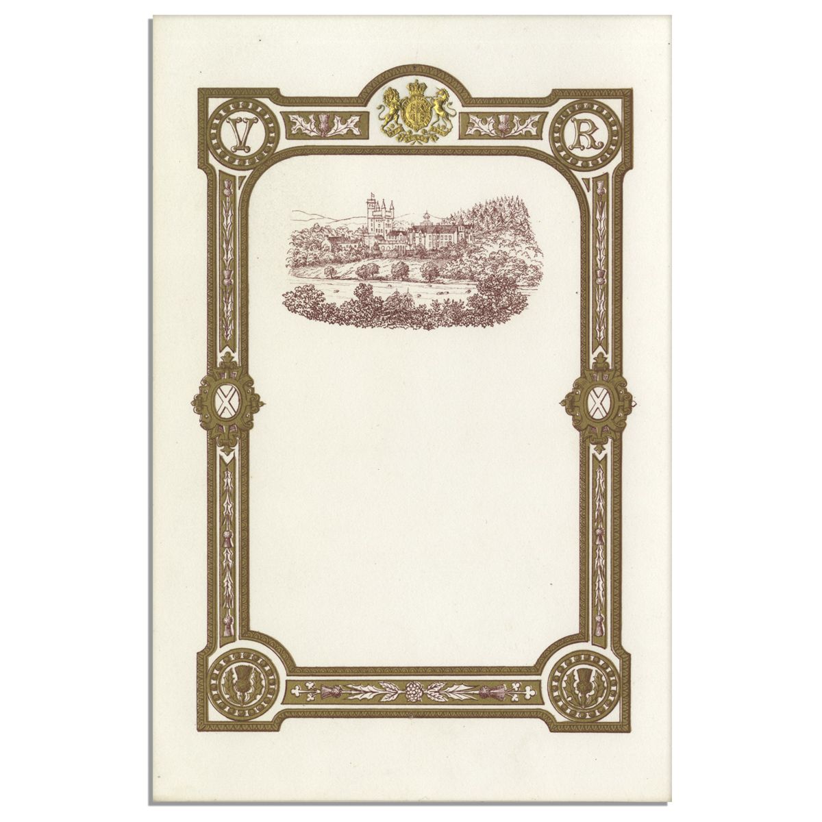 Blank dinner menu from the Royal Family's Balmoral Castle in Scotland, from the era of Queen Victoria. Menu features an ornate printed bronze frame with various royal insignia, as well as a gilt crest at top center. An illustration of the castle from afar heads menu. Measures 5.75'' x 8.75'' with minor toning, and a tiny pinhole to top, else near fine.